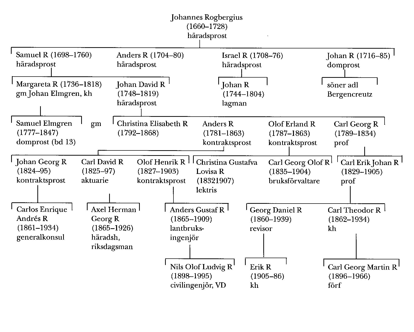 Johannes Rogbergius' son Anders R (1704–80) var häradsprost i Åseda, Kron, och dennes bror Israel R (1708–76) i sin tur i Vittaryd, Kron. Den senare var även ledamot av prästeståndet 1755–56. Hans son häradshövdingen och titulärlagmannen Johan R (1744-1804) var 1789–93 ledamot av HD.