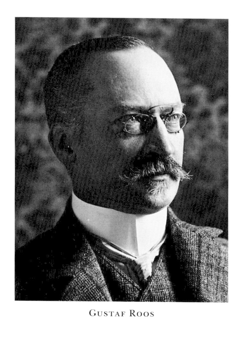 2 Roos, Gustaf Wilhelm Alexander, son till R 1, f 6 sept 1859 i Sthlm, Finska, d 19 jan 1938 där, Osc. Mogenhetsex vid Nya elementarskolan i Sthlm 17 maj 77, inskr vid UU 21 sept 77, jur fil ex 13 sept 79, ex till rättegångsverken där 24 maj 82, e o notarie i Svea hovrätt 5 juni 82, i Sthlms rådstuvurätt 8 sept 82, sekr åt prof A E Nordenskiöld 82–83, kanslist i AK 83, auskultant i Hovrätten över Skåne o Blekinge 14 jan 84, länsnotarie i Blekinge län 30 okt 85, ord 8 maj 86, v häradsh 18 dec 85, sekr o kamrerare vid Blekinge läns landsting 86–98, landssekr i Blekinge län 27 aug 98, led av AK 03–08 (led av tillf utsk 03–05 lagt, av andra särsk utsk 05 lagt, av bevilln:utsk 06), led av komm ang rikets indeln i läkardistr juni 04–maj 06, av yrkesfarekomm jan 05–maj 06, av komm ang ledn:en av statens järnvägsbyggnader dec 05–mars 06, konsultativt statsråd 29 maj 06–17 mars 09, led av jordundersökn:en dec 11–okt 12, landsh i Gotlands län 18 okt 12–30 sept 27, ordf i Sv fåravelsfören 23, led av FK 28–35 (ordf i andra tillf utsk 28-30).