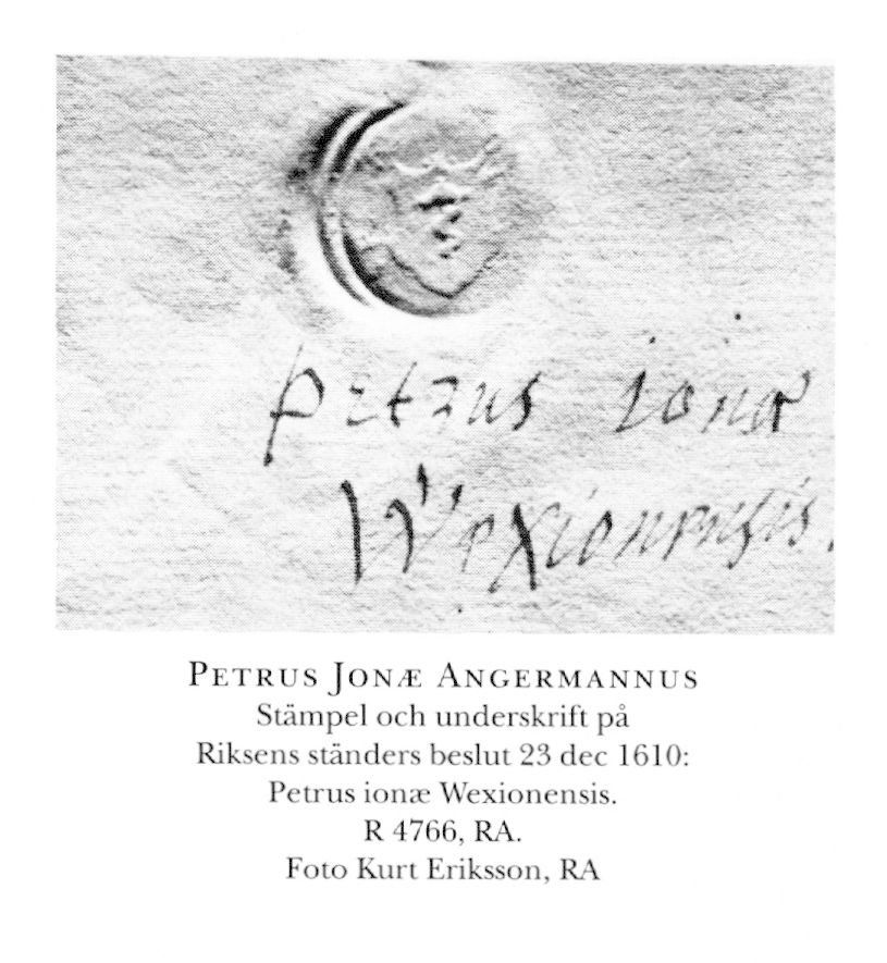 Petrus Jonæ Angermannus, f 1559 sannolikt i Arnäs, Vnl, d 11 sept 1630 i Växjö. Fader: möjl bonden Jon Hindersson (jfr bd 24, s 247). Inskr vid univ i Jena 89, mag där 4 aug 90, rektor i Arboga 91, kh där 93 trol i maj, vigd till biskop i Växjö 26 okt 95 (tilltr maj 96).