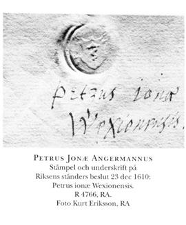 Källor o litt: H Cnattingius, Den centrala kyrkostyr i Sverige 1611–1636 (1939); R Dahlberg, Ett dedikationsex av Petrus Jonaes Cursus visitadonis Dicecesis Wexionensis (NTBB 1933); H Holmquist, Sv kyrkans hist, 3:2 (1933) o 4:1 (1938); N Krokius, Een lijkpredikan ... hållen när ... M Petri Jonae Angermanni bleff uthi sin hwilokammar ... fördt (1630); L-O Larsson, Småländsk hist, Stormaktstiden (1982); dens, Växjö genom 1000 år (1991); E Liedgren, Sv psalm o andlig visa (1926); H Lundin, Joannes Baazius' kyrkl reformprogr (1944); H Lundström, Om Petrus lönas Angermannus' förmenta deltagande i 1600 års bibelkommitté m m (Sami 1900); R Olsson, Abraham Angermannus (1946); H Pleijel, Det gamla Växjöstiftet under hustavlans tid (Växjö stift i ord o bild, 1950); N Runeby, Monarchia mixta (1962); R Steffen, Petrus lönas Angermannus o uppg:en om Heming Gadhs bok de Pastore (Sami 1899); I Svalenius, Tiden från 1523 till 1718 (Växjö stads hist, 1:2, 1956); Västerås hm, 1:2(1949); Växjö hm, 1 (1921).
