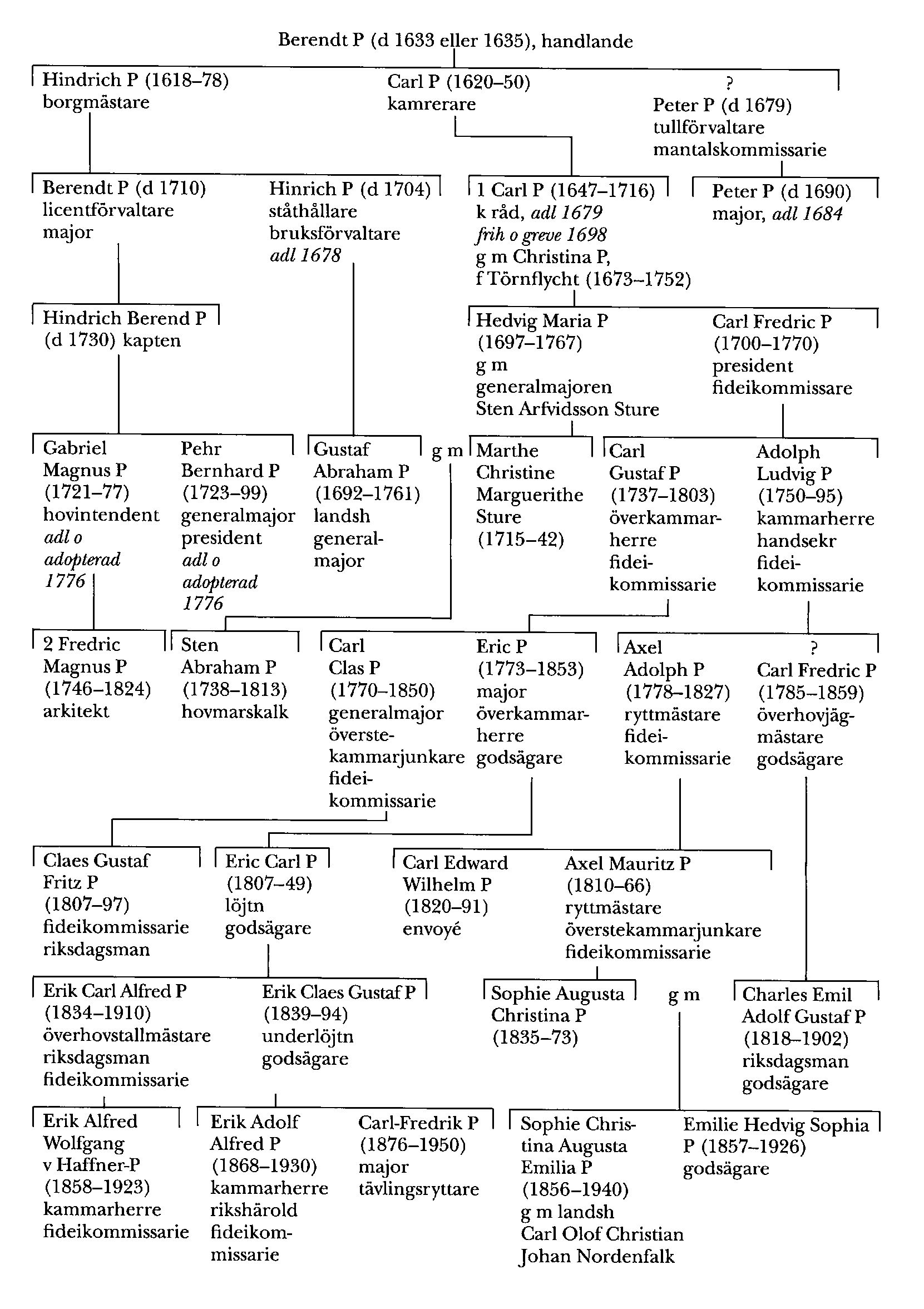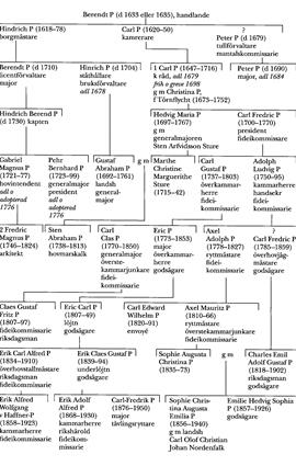 Berendt P:s son (Emporagrius) kamreraren i Krigskollegium Carl P (1620–50) var far till k rådet Carl P (P 1), som adlades 1679 och blev friherre och greve 1698. Dennes änka Christina P (1673–1752) var dotter till en av landets förmögnaste affärsmän, Olof Törnflycht. Hon gjorde 1747 till fideikommiss för sin son Carl Fredric P (1700–70) dels Andrarums alunbruk i östra Skåne, där hon låtit uppföra det efter henne uppkallade slottet Kristinehov, jämte godsen Högestad och Baldringe, dels Ängsö i Västmanland, för sin dotterson sedermera riksrådet Nils Adam Bielke (bd 4) Sturefors i Östergötland, och för dennes syster Eva Charlotta Bielke, senare gift med hovmarskalken Fredric Gustaf Gyllenkrok (bd 17, s 576), Hässelbyholm i Södermanland.