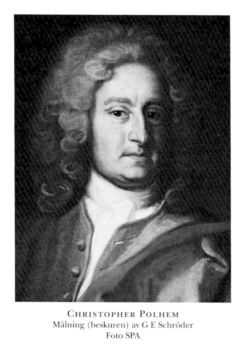 1 Polhem, Christopher, före adl Polhammar, f sannolikt 18 dec 1661 i Tingstäde, Gotl, d 30 aug 1751 i Sthlm (begr 6 sept där, Maria). Föräldrar: handelsmannen Wolf Christoph Polhammer o Christina Eriksdtr Schening. Fogde på Fållnäs gård, Sorunda, Sth, 85, inskr vid UU 12 nov 87, erhöll statlig pension 6 maj 91 (bekräftat 21 mars 92), testimonium academicum från UU 18 okt 94, dir över bergsmekaniken från 12 febr (notifikation till P 17 febr) 98, grundade tills med Gabriel Stierncrona Stjernsunds manufakturverk, Husby, Kopp, 1 maj (Bergskoll:s priv 29 maj) 00, ledare där 00–35, konstmästare vid Stora Kopparberget i Falun 29 mars 00–20 jan (notifikation till P 19 april) 16, assessor över stat i Kommerskoll 27 febr 14, kommerseråd över stat 10 dec 16, adl 15 dec 16. – Led av Collegium Curiosorum 11, av Bokwetts Gillet i Uppsala 28, LVA 39 (preses juli–sept 44).