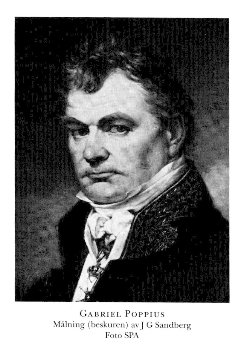 1 Poppius, Gabriel, f 18 febr 1769 i Jockas (Juva), S:t Michels län, d 3 jan 1856 i Danderyd, Sth. Föräldrar: kyrkoherden Henrik P o Katarina Nyländer. Inskr vid trivialskolan i Rantasalmi, S:t Michels län, 21 juni 83, vid Åbo akad 1 okt 86, disp där 12 maj 92, auskultant i Åbo hovrätt 16 maj 92, ord kanslist där 22 juni 95, v häradsh 17 dec 98, notarie i hovrätten 20 juni 99, häradsh i Övre Satakunda nedredels härads domsaga 8 okt 99, föredragande av ägodeln:s- o storskiftesmål i Justitierevisionen o HD 20 jan 01, lagmans titel 23 dec 01, led av flera riddarsynerätter 04–08, av Rikets ärenders allm beredn 1 mars 05–09, genom transport häradsh i Öster- o Västerrekarne härads domsaga, Söd, 27 april 08 (tjänstl), justitieråd 12 juni (tilltr 21 juli) 09–26, led av komm ang en tryckfrihetsförordn juli–sept 09, av förberedande lagkomm nov 10–febr 11, granskande led av lagkomm febr 11–aug 26, ordf i dir för Nummerlotteriet 20 jan 13–11 dec 41, led av dir för Allm brandförsäkr:verket för byggnader å landet 1 nov 15–31 okt 22, president i Kommerskoll 21 sept (tilltr 6 nov) 26–14 sept 33, ordf i dir för Teknolog inst 20 april 27–8 dec 32, i komm ang ny organisation av Kommerskoll sept 28–mars 31, i komm ang tullrätternas upphörande eller förändr sept 28–april 31, led av komm ang ny organisation av hallrätterna sept 28–maj 33, av prästeståndet vid riksdagarna 28–41 (led av bankoutsk 28–30 o 40–41), led av komm ang tullen på spannmål okt 29–jan 30, ordf i komm ang ny exp:taxa nov 32–juni 36, statsråd 14 sept 33–6 juli 36, ordf i dir för Sällsk för nyttiga kunskapers spridande från 19 dec 33, i tullförfattn:komm jan–maj 34, dir för LA från 1 juni 38. – LLA 17, LPS 17, jur hedersdr vid UU 15 juni 18, LVA 27 (preses 29–30), serafimerriddare 6 febr 43.