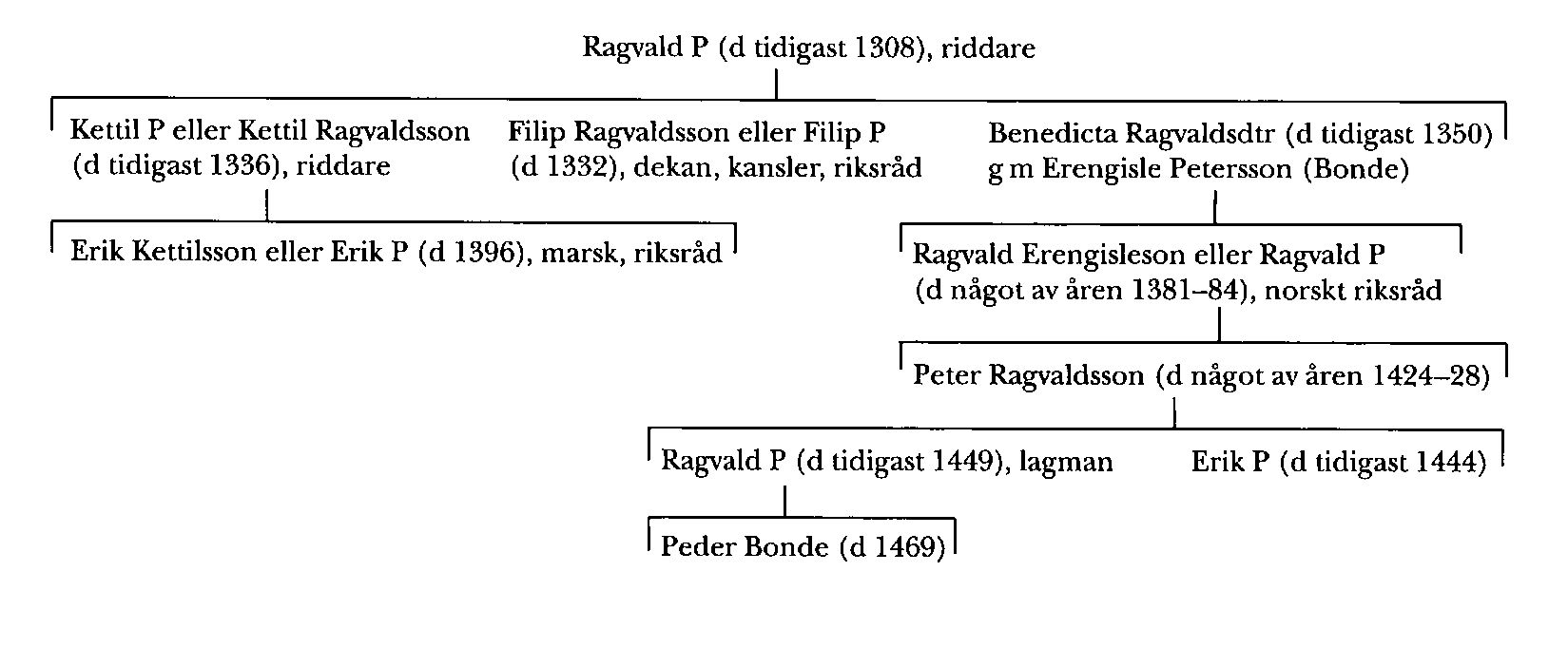 Hans son Peter Ragvaldsson (d något av åren 1424–28) blev far till tre söner med namnet P. En av dem, Ragvald P(d tidigast 1449), deltog i mötet i Vadstena 1436, där stillestånd slöts mellan kung Eriks ombud och det sv riksrådet. Enligt en vid Karlskrönikans slutredigering struken uppgift skall han ha varit den ene av de båda män som genom sitt avslöjande för Karl Knutsson blev den utlösande faktorn till upprorsledaren Erik P:s (jfr nedan) avrättning 1437. Ragvald P deltog också i unionsmötet i Kalmar 1438, herredagen i Arboga 1440 och Kalmarmötet 1441, men ättartavleuppgiften, att han var riksråd, är oriktig (Löfqvist). Åtminstone 1441–48 (jfr bd 27, s 56) var han emellertid lagman i Östergötland, och våren 1449 (Sparre; jfr perg:brev) blev han riddare. Denna kognatiska gren av släkten P dog ut på manssidan med P:s ende son, som hette Peder Bonde (d 1469) och stupade i striden vid Herrljunga i Västergötland. Den sistnämndes syster Ingeborg Ragvaldsdotter blev gift med riksrådet och lagmannen i Södermanland Peder Ragvaldsson (Fargalt; bd 15). Systerson till Ragvald P var den kort före sin död 1470 till ärkebiskop i Uppsala postulerade dekanen i Linköping Tord Petersson, även kallad Tord Bonde eller Tord Bonde Petersson.