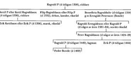 Ragvald P (d tidigast 1308): B Beckman, Matts Kättilmundsson, 1–2 (1953–54); DS 1–2 (1829–37); H Jägerstad, Hovdag o råd under äldre medeltid (1948), s 322 o 335; [K H Karlsson,] Bonde-slägten under medeltiden (Örnberg, 6, 1890), s 87; A F Liljeholm, Birgittaättlingar i Sverige o Norge, 3 (Genealog tidskr, 3, 1952–54); Miracula S Erici regis et martyris (SRS 2:1, 1828), s 305; A Mohlin, Kristoffer II av Danmark, 1 (1960), s 381 f; J Rosén, Striden mellan Birger Magnusson o hans bröder (1939); ST 1 (1877), s 335.