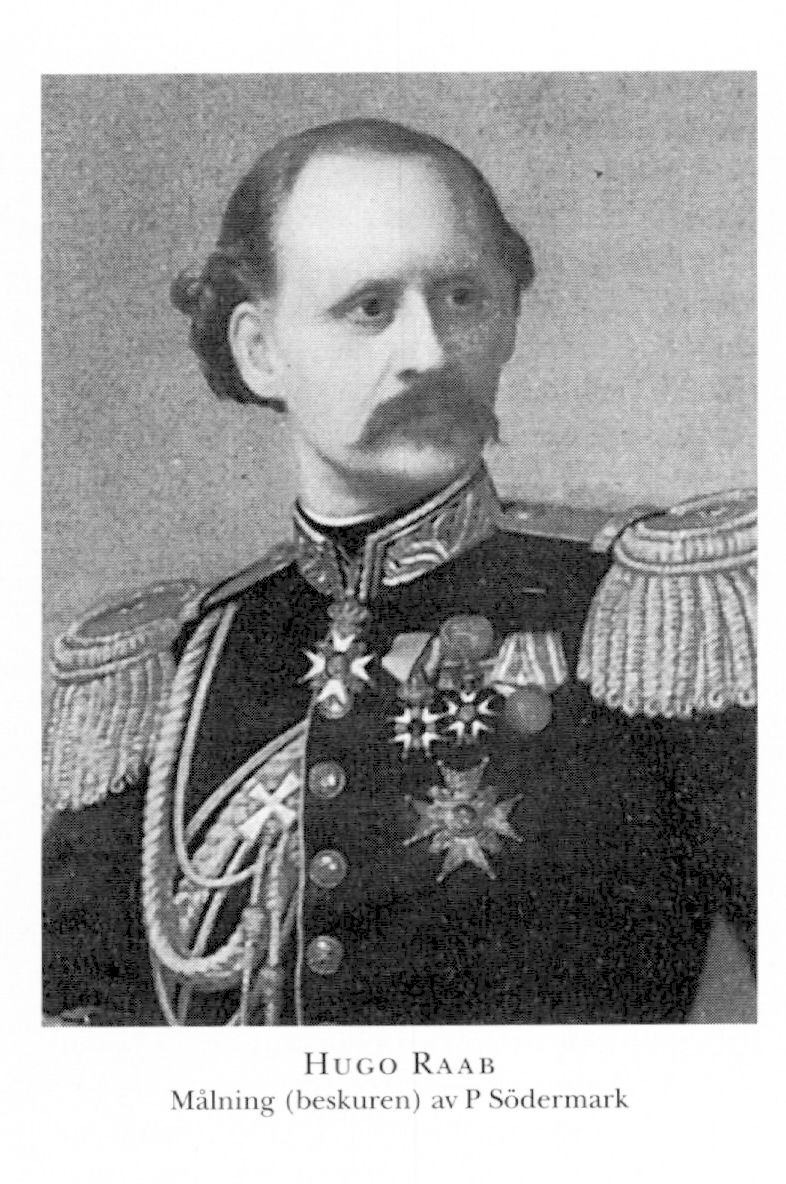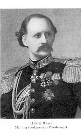 2 Raab, Claes Fredrik Hugo, son till R 1 i hans första g, f 25 nov 1831 i Ryssby, Kalm, d 11 dec 1881 i Sthlm, Jak o Joh. Elev vid Nya elementarskolan i Sthlm, kadett vid Krigsakad på Karlberg april 47, officersex där 31 okt 50, underlöjtn i Kalmar reg 9 nov 50, vid reg 28 okt 51, andre adjutant där 9 maj 54, elev vid Die allgemeine Kriegsschule i Berlin okt 55–juni 58 (avgångsbetyg dat 15 nov 58), adjutant hos svensk-norske ministern Carl v Mansbach där 56–58, löjtn vid Kalmar reg 24 juli 57, generalstabsofficer 20 april 59, premiärlöjtn i danska armén 2 mars 64, kompanichef där 24 mars 64, erhöll avsked ur dansk krigstjänst 24 aug 64, sekr i fälttjänstreglementskomm 64, kapten i armén 28 jan 65, lär i taktik, reglementen o krigsartiklar vid KrVA 65–66, i krigskonst o krigshist vid H artillerilärov o vid arméns Krigshögsk 66–73, kapten vid Kalmar reg 5 okt 69, major i armén 26 maj 70, sekr i försvarsutsk vid urtima riksdagen 71, överstelöjtn i armén o chef för Lantförsvarsdep:s kommandoexp 12 april 72, medverkade vid utarb o granskn av olika härordn:förslag 73–74, överste och chef för Generalstaben från 5 dec 73, led av komm ang Karlsborgs fästiv.s ställn mars–maj 76, av komm ang Sveriges offentl kartverk maj 77–maj 78, generalmajor i armén 14 dec 77, led av komm ang lantförsvarets ordnande periodvis från nov 80. – LKrVA 63.
