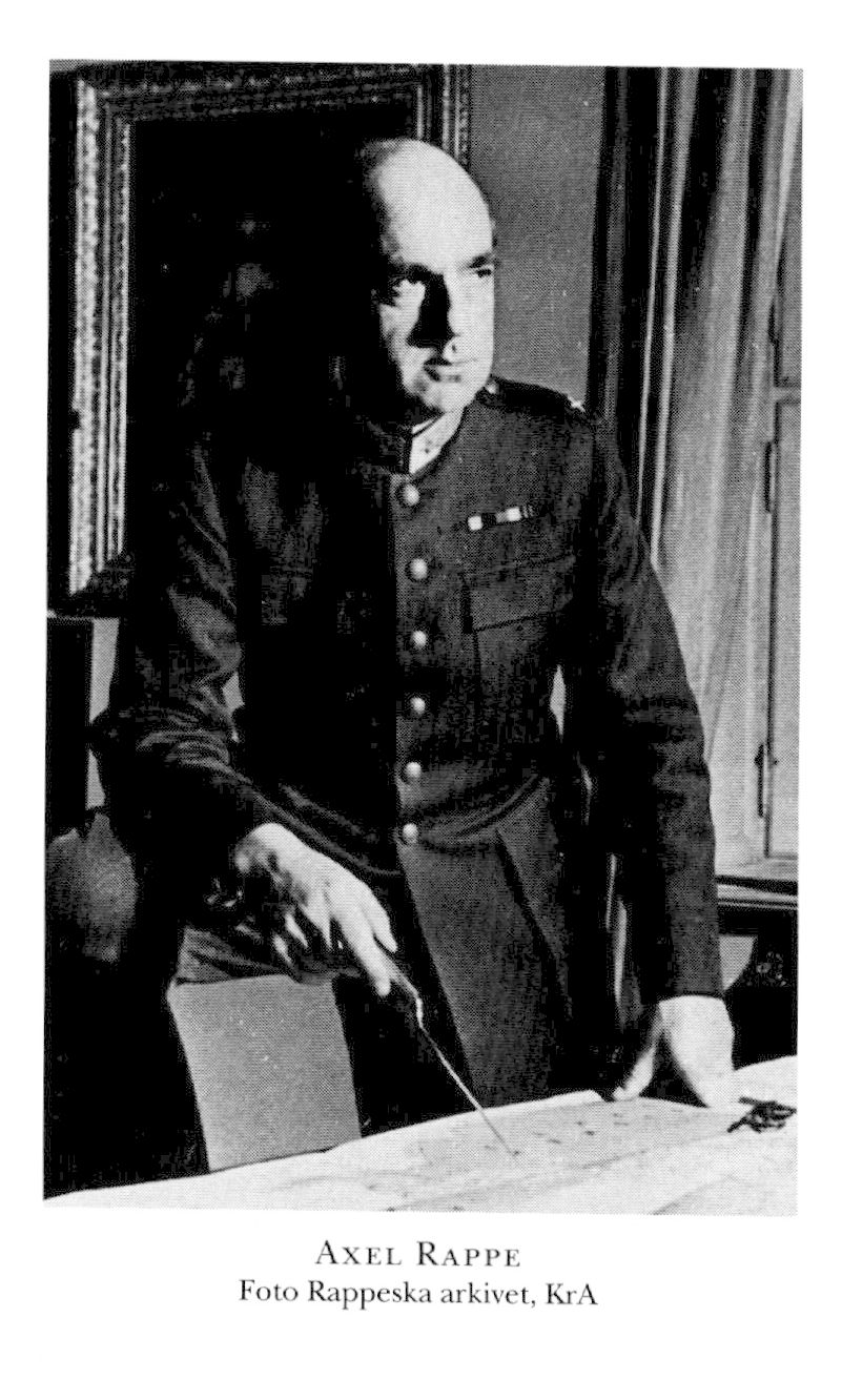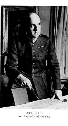 5 Rappe, Axel Oscar, son till R 3, f 22 juni 1884 i Bo, Sth, d 31 okt 1945 i Karlstad. Mogenhetsex vid H reallärov å Norrmalm, Sthlm, 16 maj 02, volontär vid Första Svea artillerireg 9 juni 02, officersex 28 nov 04, underlöjtn vid Svea artillerireg 8 dec 04, elev vid Artilleri- o ingenjörhögskolan 06–07, löjtn av 2 kl vid reg 31 aug 07, elev vid Krigshögskolan 08–10, aspirant vid Generalstaben 1 maj 11–30 april 13, löjtn av 1 kl vid reg 9 juni 11, bitr lär i krigskonst vid Artilleri- o ingenjörhögskolan 14–18, kapten av 2 kl vid reg 30 dec 16–12 febr 18, i krigstjänst i Finland 13 febr–31 juli 18 (major vid Gustaf Mannerheims generalstab 22 febr, överstelöjtn 12 april, stabschef i Östarméns stab 12 april–31 juli), åter kapten av 2 kl vid Svea artillerireg 29 okt 18, kapten av 1 kl vid reg 11 april 19, lär i krigskonst vid Artilleri- o ingenjörhögskolans högre kurser 22–29, sektionschef vid Generalstabens krigshist avd 10 nov 24–15 nov 27, stabsadjutant o kapten vid Generalstaben 6 maj 27, major där 1 jan 28, stabschef vid Militärbefälet för övre Norrland 1 jan 28–26 sept 30, vid Östra arméfördeln:s stab 4 okt 30–4 okt 31, militär sakk i 1930 års försvarskommission 10 sept 31–30 aug 35, chef för Generalstabens centralavd 9 okt 31–1 nov 35, överstelöjtn i Generalstaben 18 dec 31, vid Generalstaben 7 okt 32, överste i Generalstaben 23 juni 35, överste o chef för Göta artillerireg 31 jan (tilltr 1 okt) 36, chef för Svea artillerireg 21 jan (tilltr 1 okt) 38, generalmajor i armén 3 nov 38, i generalitetet 20 jan 39, till chefens för Försvarsstaben förfogande 1 febr 39, ställföretr chef för Försvarsstaben 15 dec 39–31 mars 41, led av militära förvaltn:utredn nov 40–febr 41, inspektör för artilleriet 10 jan (tilltr 1 april) 41, militärbefälhavare i Femte militärområdet 30 juni (tilltr 1 okt) 42, i Fjärde militärområdet o tillika överkommendant för Sthlms garnison 1 april 44 (utn återkallad). – LKrVA 32.