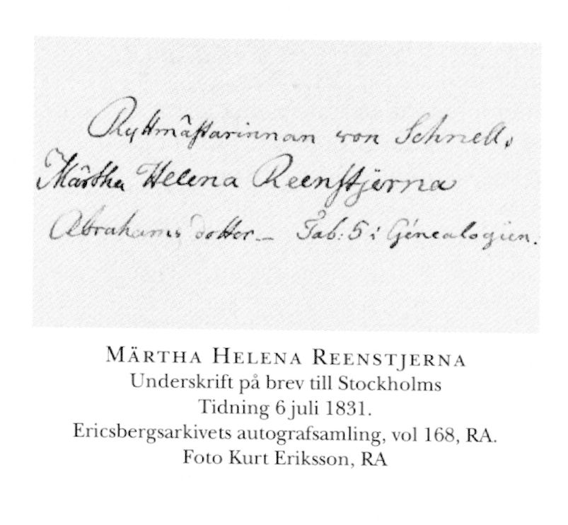4 Reenstjerna, Martha Helena, sonsons sondtr till R 2, f 16 sept 1753 i Hov, Älvsb, d 12 jan 1841 i Brännkyrka, Sth. Föräldrar: löjtnanten Abraham R o frih Catharina Maria v Köhler. Dagboksförf.
