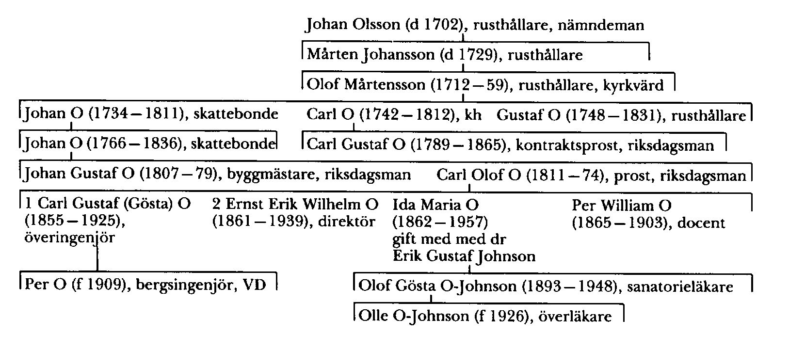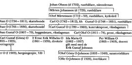 Carl o Gustaf O:s äldste bror, skattebonden Johan O (1734–1811) i Åkesta, Skultuna, Vm, som kan beläggas med namnet O redan i en faddernotis 1751 (Leijonhufvud), blev farfar till byggmästaren Johan Gustaf O (1807–79) i Åkesta, som var riksdagsman i bondeståndet 1862–63, och till domkyrkokomministern i Västerås Carl Olof O (1811–74), som var riksdagsman i prästeståndet 1859–60 och blev kh i Kolbäck, Vm, 1861 och prost 1865. Den sistnämnde var far till direktören Ernst Erik Wilhelm O (O 2) och till Per William O (1865–1903), som blev docent i grekiska språket och litteraturen vid UU 1896, promoverades till fil dr 1897 och var svärson till sin farbror Johan Gustaf O. Dessas äldre bror överingenjören Carl Gustaf (Gösta) O (O 1) var far till fd VD vid ab Bofors bergsingenjör Per O (f 1909).