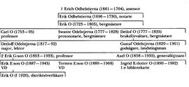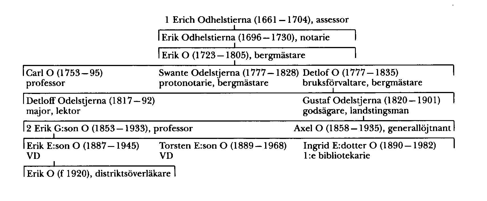 Odelstierna (Odhelstierna, Odelstjerna), släkt, härstammande från professor Ericus Odhelius' (s 54) son assessor Erich Odhelius, som 1698 adlades med namnet O men skrev sig Odhelstierna (O 1). Hans son notarien i Bergskollegium Erik Odhelstierna (1696–1730) blev i äktenskap med en dotter till bergmästaren David Leijell (bd 22, s 450) svärfar till bergsrådet Sven Rinman och far till Erik O (1723–1805), som var bergmästare vid Nya Kopparberget i Västmanland 1761–93.