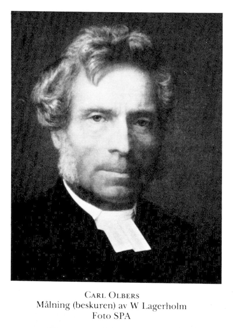 Olbers, Carl, f 18 nov 1819 i Fors, Älvsb, d 5 april 1892 i Lund. Föräldrar: assessorn Vincent O o Helena Larsdtr. Inskr vid LU 29 sept 40, filol kand-ex där 20 juni 43, prästv i Lund 17 dec 44, pastoratsadjunkt i Träslöv, Hall, 24 dec 44–24 juni 46, fångpredikant vid Varbergs länshäkte febr 45–juni 46, FK vid LU 12 juni 47, disp pro gradu 21 juni 47, mag 23 juni 47, doc i pastoralteologi 4 april 48, allt vid LU, biträde hos förste stadskomministern i Lund Achatius Kahl (bd 20) jan 49–juni 50, tf prof i teor filosofi vid LU ht 51–vt 52, i prakt teologi bl a vt 53–ht 54, ht 55, ht 56–vt 58 o ht 61–febr 63, teol adjunkt där o prebendekh i Stångby o Vallkärra, Malm, 30 nov 53, prost 15 febr 54, tf prof i kyrkohist o symbolik vid LU 15 okt 59–8 nov 60, prebendekh i Västra Kärrstorp o Glostorp, Malm, 1 maj 59, prof i prakt teologi vid LU o prebendekh i Hällestad med flera förs:ar, Malm, 13 febr (tilltr 1 maj) 63, prof i kyrkohist o symbolik vid LU 15 sept 65, TD 24 mars 68, prom 28 maj 68 där, ordf i prästmötesberedn 70 o 76, rektor för LU 72 -73, led av allm kyrkomötet 73, 78, 83 o 88, av komm ang nya statuter för UU o LU mars–okt 74, förste teol prof vid LU o domprost från 12 dec 79 (tilltr 1 maj 80).