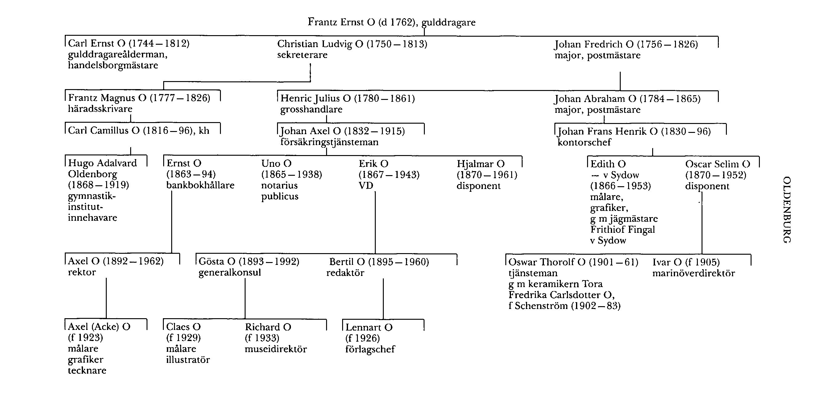 Oldenburg, släkt härstammande från gulddragaren Frantz Ernst O (f omkr 1716 enl Botkyrka A 1:2; d 1762), som fick burskap i Sthlm 1748 och då uppgavs vara född i Braunschweig. Han blev så småningom ägare av ett par stenhus i Sthlm, hälften av Nyköpings sockerbruk och en fjärdedel i Hornsbergs sockerbruk på Kungsholmen i Sthlm samt säteriet Tullinge i Botkyrka, Sth.