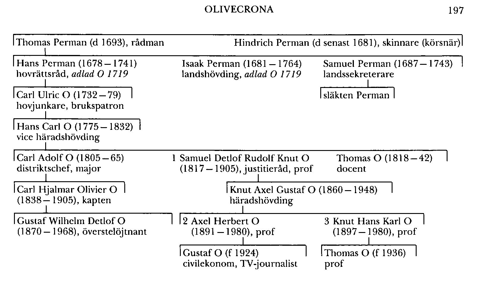 Två äldre söner till Thomas Perman adlades 1719 med namnet O. Den yngre av dessa, Isaak O (1681–1764), hade 1716 blivit häradshövding i Trögds, Åsunda, Bro och Håbo härad i Uppland, blev assessor i Svea hovrätt 1728 och hovrättsråd 1738 samt fick landshövdings n h o v 1755. Han var en av hattpartiets ivrigare anhängare och ledamot av SU vid riksdagen 1738–39 samt av den kommission som efter kriget mot Ryssland dömde generalerna C E Lewenhaupt (bd 22) och H M von Buddenbrock (bd 6) till döden 1743. O blev svärfar till den som heraldiker bekante assessorn Daniel Gustaf Cedercrona (bd 7).