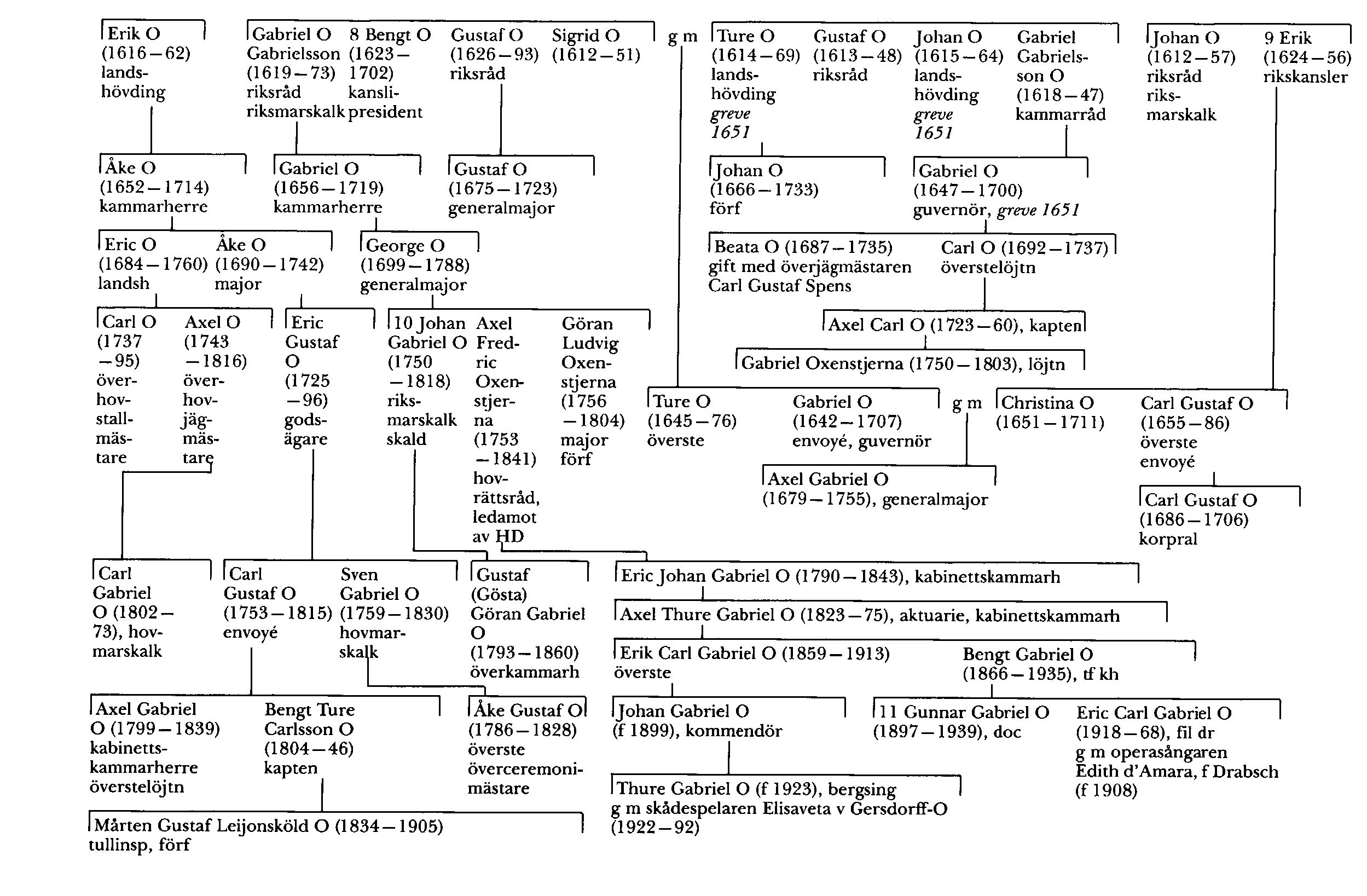 I äktenskap med en dotter till riksrådet och lagmannen Axel Eriksson (Bielke; bd 4), alltså en faster till Johan III:s andra gemål, blev G svärfar till riksråden Åke Axelsson (Natt och Dag; bd 26), Carl Bonde (bd 5), Jöns Kurck (bd 21), och Johan Sparre och far till rikskanslern Axel O (O 6). Denne blev greve 1645 och stamfar för den släktgren som på Riddarhuset efter hans grevskap kom att kallas O af Södermöre. Han var svärfar till riksmarsken Gustav Horn (bd 19) och far till Johan O A:son (1612–57). Denne inskrevs vid UU redan 1621 och vid universitetet i Leiden 1631 samt blev magister i Oxford 1633 i samband med att fadern sänt honom till England för att officiellt underrätta om Gustav II Adolfs död. Likpredikningarnas uppgift, att han en tid skulle ha varit överste för det redan 1631 upphörda s k Röda infanteriregementet, torde enligt KrA:s handlingar vara oriktig. 1634 var O ånyo på beskickning till England och även till Holland, och 1635 var han en av de fem sv kommissarier som i Stuhmsdorf i Ostpreussen slöt stillestånd med Polen (jfr bd 5, s 688 o 690, 23, s 148, o 26, s 444). Han blev kammarråd 1637 och riksråd och kansliråd 1640 samt det ena av Sveriges ombud vid westfaliska fredskongressen 1641. Först 1643 begav sig emellertid O till Westfalen efter att sedan 1641 ha ägnat sig åt reorganiseringen av förvaltningen av Pommern och förhandlingar med kurfursten av Brandenburg. Vid fredskongressen hävdade han i enlighet med faderns anvisningar med skärpa de sv kraven, men han hade på grund av bristande smidighet svårt att komma överens med sin lågbördige men mer begåvade och erfarne kollega Johan Adler Salvius (bd 1), som vid flera tillfällen bakom hans rygg för motparten avslöjade Sveriges yttersta villkor men stöddes av drottning Kristina. O omtalas därjämte ej sällan som upphetsad av starka drycker (Odhner 1876, s 144), så att det var svårt att förhandla med honom om eftermiddagarna (Dickmann, s 197). Efter fredsslutet 1648 blev han en av de tre ledamöterna av den kommission som skulle ordna förhållandena i Pommern (jfr bd 23, s 148 f) och han deltog också i förhandlingarna om gränsen mot den del av Pommern som tillfallit Brandenburg. Först 1651 återkom O till Sverige, där fadern 1652 överlät sitt finländska friherreskap Kimito till honom. Han blev lagman i Uppland 1653 och riksmarskalk 1654. Sistnämnda år blev O också den förste kanslern för Greifswalds universitet, och 1655 blev han president i Wismarska tribunalet och – som kompensation för att hans yngre bror blivit faderns efterträdare som rikskansler (Wittrock 1917) – Sveriges befullmäktigade legat i Tyskland. Genom sitt första äktenskap – med den sista medlemmen av grevliga ätten Sture – hade han kommit i besittning av bl a Hörningsholm på Mörkö och Tullgarn i Hölö, båda i Södermanland, vilka efter hennes död utan barn 1646 ärvdes av hennes mor, som testamenterade godsen till O; en av moderns släktingar väckt arvsprocess var ännu vid hans död ej avgjord. O gifte 1648 om sig med sin ungdomskärlek Margareta Brahe (bd 5), som var änka efter hans fars kusin Bengt O (se nedan) och syster till riksdrotsen Per Brahe d y (bd 5), men hon var, f 1603, för gammal för att kunna få barn. Vid sin död var han landets störste godsägare (Asker). O:s grav finns liksom faderns och farfaderns i Jäders kyrka i Södermanland.