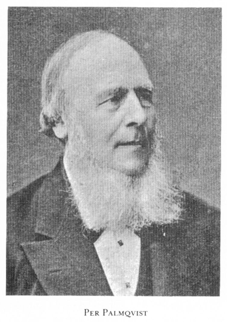 Palmqvist, Per, f 8 april 1815 i Norra Solberga, Jönk, d 10 aug 1887 i Ringarum, Ög (enl db för Sthlm, Hovförs). Föräldrar: hemmansägaren o kyrkvärden Sven Larsson o Helena (Lena) Nilsdtr. Elev vid MA vt 38, organist- o kyrkosångarex där 14 juni 38, lär i privatskolor i Sthlm juni 39—78, klockare i Hovförs 46, pianostämmare o kyrkosångare i Sthlm, utg av tidskr Evangelisten 48—51, bokförläggare från 50 o deläg i boktryckerifirmorna Elde & Co 55, A Holmberg & Co 65 o P Palmqvist ab från 73, led av styr för Sällsk för religionsfrihetens befrämjande 52, grundare av Evangeliska alliansens sv avd 21 juni 53, av Sthlms missionsfören 13 mars 56.