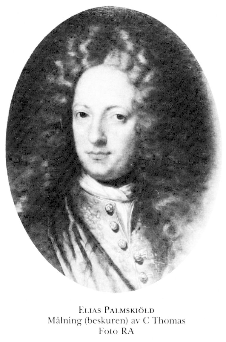 2 Palmskiöld, Elias, före adl Runell, son till P 1, f 18 juli, dp 22 juli 1667 i Sthlm, Nik, d 7 april 1719 där (själaringn i Nik). Inskr vid UU 14 maj 79, adl tills med föräldrarna 13 april 81, kanslist i RA 5 febr 85–dec 86, auskultant i Svea hovrätt 5 febr 90, i lagkommissionen 7 mars 90, sekr:s i RA biträde 9 mars 91, aktuarie i RA 16 sept 93, tf aktuarie i KM:ts kansli 12 febr 97, ord 27 april 97, arkivsekr vid RA från 25 nov 02, sekr i defensionskommissionen 18 juni 12–14.