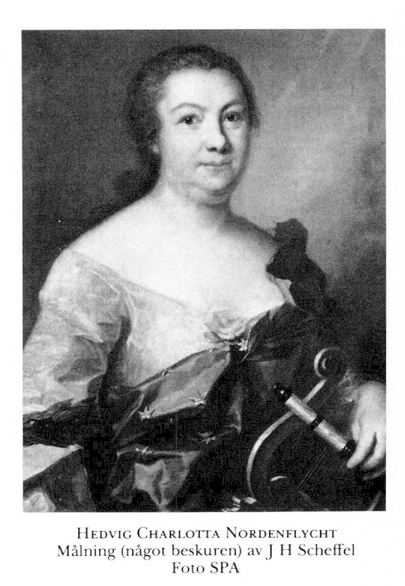 Nordenflycht, Hedvig Charlotta, f 28 nov (N i Sv Mercurius 1763), dp 30 nov 1718 i Sthlm, Hedv El, d 29 juni (Inrikes tidn:ar), begr 2 juli 1763 i Sko, Upps. Föräldrar: kamreraren Anders Nordbohm, adl N, o Christina Rosin. Förf.