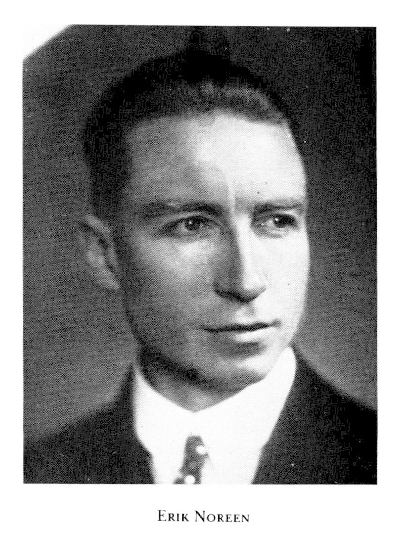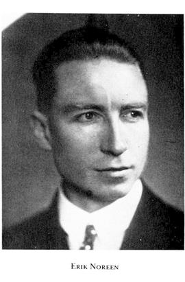 2 Noreen, Erik, son till N 1, f 3 nov 1890 i Uppsala, d 13 dec 1946 i Solna (kbf i Domk, Uppsala). Mogenhetsex vid Uppsala privatgymn 30 maj 08, inskr vid UU 1 sept 08, FM 30 maj 11, FL 15 dec 14, disp 28 maj 15, FD 31 maj 15, doc i nord språk 22 dec 15, allt vid UU, sekr i ortnamnskomm 16–juni 30, i ortnamnskommissionen 30–31 o från 43, tf prof i nord språk vid UU sept–dec 22 o febr–mars 23, sekr i Sthlms stads byggn: nämnds namnberedn 1 juni 24–1 sept 31, lär vid Sthlms stads h folkskola för tekn utbildn 1 juli 24–20 febr 31, gymnasielär vid Nya elementarskolan för flickor i Sthlm ht 24–vt 31, doc i nord språk vid StH 28 okt 24, lär vid Sandströmska lärarinnesem i Sthlm ht 27–vt 29, vid Palmgrenska samskolan där ht 29–vt 31, prof i nord språk vid LU 20 febr 31, vid UU från 22 nov 40 (tilltr 1 jan 41), red o medred för ANF 38–45, led av styr för Landsmåls- o folkminnesarkivet i Uppsala från 41, inspector musices vid UU från 42. – LGAA 32, LHVL 32, LVSL 32, LHVU 41, LVHAA 44.