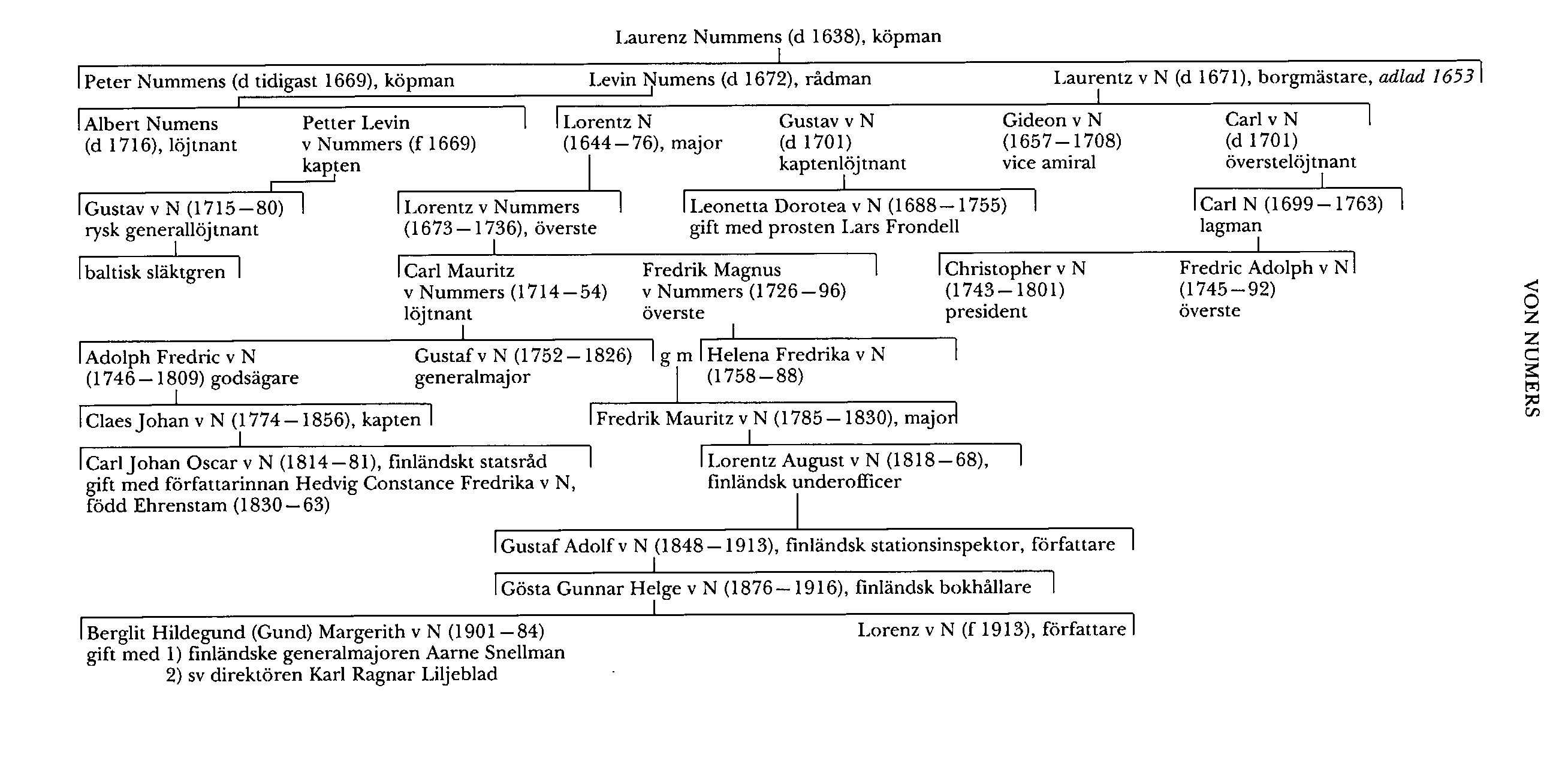 Peter Nummens' och Levin Numens' bror Laurentz Numens (d 1671) flyttade till Narva 1637 (Livonica 11:68), blev senare borgmästare där och lånade liksom Levin Numens ut stora summor till sv kronan. Han adlades 1653 med namnet N och introducerades på riddarhuset 1654 såsom v N. Av hans söner deltog Gideon v N (1657–1708) i kriget mot danskarna 1675–79 och i de engelska och holländska flottornas operationer 1694. Han blev 1700 befordrad först till schoutbynacht och sedan till v amiral. v N förde 1701–03 befäl över en flottilj, som opererade i Finska vikens innersta del och på Ladoga.
