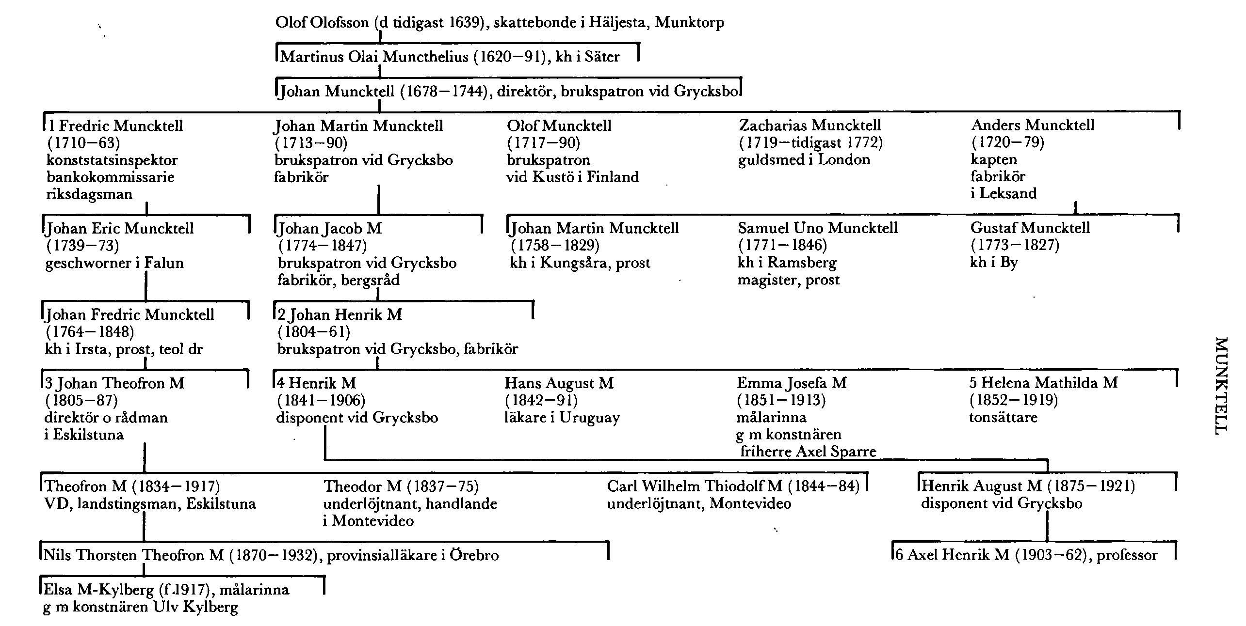 Olof, Zacharias och Anders Muncktells äldste till vuxen ålder levande bror var konststatsinspektorn, bankokommissarien och riksdagsmannen Fredric Muncktell (M 1). I äktenskap med markscheidern Johan Tobias Geislers (bd 17) enda dotter var han far till geschwornern Johan Eric Muncktell (1739—73) i Falun. Denna var morfar till den som dialektforskare bekante kontraktsprosten Olof Ulric Arborelius (bd 2) och till den som lokalhistoriker bekante kontraktsprosten Olof Rudolf Bellander (bd 3) samt far till Johan Fredric Muncktell (1764— 1848), som blev komminister i Kärrbo, Vm, 1794 (tilltr 1795), kh i Sevalla, Vm, 1815 (tilltr 1816), prost 1816, kh i Irsta, Vm, 1820 (tilltr 1821), LSkS 1833 och teol dr 1844. Han donerade pergamentsbrev till VHAA på 1830-talet och publicerade Westerås stifts hm, 1-3 (1843-46). I Västerås stadsbibliotek finns hans efterlämnade samlingar, bl a en dagbok 1814—29, omfattande 1486 tätskrivna foliosidor och med inledning och kommentarer publicerad för åren 1814—21. Han var morfar till historikern och riksdagsmannen rektor Teofron Säve och far till direktören och rådmannen Johan Theofron M (M 3). Den sistnämnde hade två söner, som reste till Montevideo i Uruguay. Deras äldste bror, Theofron M (1834-1917), blev magister i Uppsala 1857, var eo elev vid bergsskolan i Falun 1857—58, blev bolagsman i faderns verkstadsrörelse 1863 och var VD for M:s mekaniska verkstads ab 1879— 89, ledamot av Söd:s landsting 1864—65 och 1869—91 samt ordförande i Eskilstuna stadsfullmäktige 1865—95. Bland hans söner var provinsialläkaren Nils Thorsten Theofron M (1870-1932) i Örebro. Thorsten M var far till målarinnan Elsa M-Kylberg (f 1917, d 2004[1]), änka efter konstnären Ulv Kylberg.
