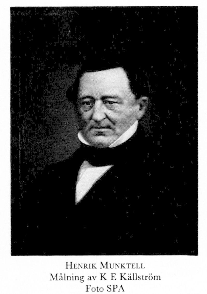 2 Munktell, Johan Henrik, brorsons son till M 1, f 9 okt 1804 i Grycksbo, Stora Kopparberg, Kopp (enl hfl för Kristine, Falun), d 8 april 1861 i Falun, Kopparberg. Föräldrar: bergsrådet Johan Jacob M o Eva Gahn. Inskr vid UU 21 okt 16, kansliex 24, tjänstg i k kansliet 25, studieresor i Europa 28—30, del-äg av o ledare för Grycksbo bruk 34, led av dir för Musiksällsk i Falun från 43, ensam ägare av Grycksbo bruk 30 juli 44, led av dir för Avesta järnverk 47—50, deläg i Sågmyra nickelbruk 51, led av Kopparbergs läns hushålln:sällsk:s förvaltn:utsk 51, deläg i Kopparbergs o Hofors sågverksab 54, led av styr för Kopparbergs läns sparbank från 55, av styr för Gefle-Dala järnväg 60—61, av styr for Kopparbergs ensk bank, av styr för Kopparbergs läns brandstodsbolag, av dir för Kopparbergs läns nödhjälpskassa, av Kopparbergs läns lasarettsdir. — LMA 59.