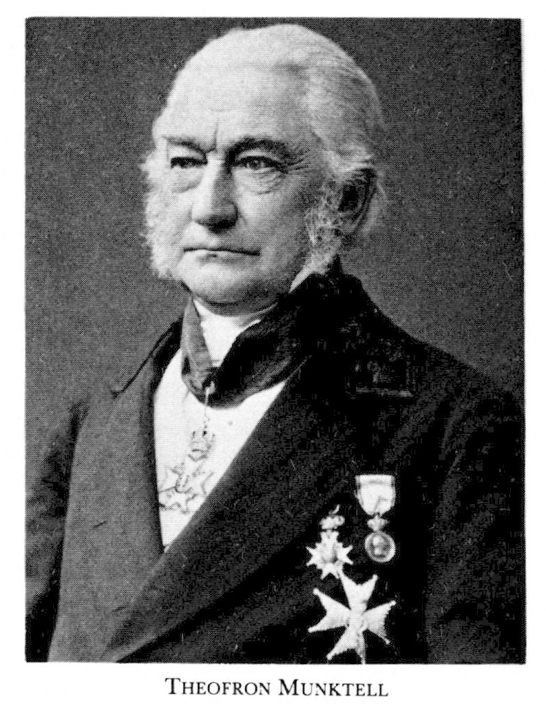 3 Munktell, Johan Theofron, sonsons son till M 1, f 22 mars 1805 i Kärrbo, Vm, d 2 juli 1887 i Eskilstuna. Föräldrar: prosten Johan Fredric M o Christina Charlotta Nohrborg. Anställd vid K myntverket 22, vid G Brolings (bd 6) degelstålverk 23, verkmästare vid K myntverket 26, arrenderade Brolings degelstålverk 29—37, ledare för Eskilstuna mek verkstad 32 — 79, dir:s nhov 2 nov 36, rådman i Eskilstuna 38, anlade ölbryggeri där 53, led av Södermanlands läns landsting 64— 66, ombud i kommitterade för järnväg till Eskilstuna 64. - Iqml 33, LLA 65, HedLLA 84, LVA 84.