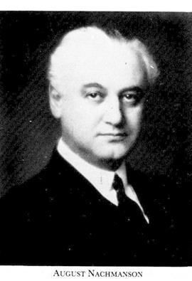 3 Nachmanson, August, bror till N 1 o N 2, f 17 april 1878 i Sthlm, Mosaiska, d 3 nov 1946 där, Osc. Elev vid Sthlms norra latinlärov o Östermalms allm lärov 87–95, vid Marieborgs folkhögskola, Östra Eneby, Ög, 95–96, vid Klagstorps lantbruksskola, Norra Kyrketorp, Skar, 96–98, vid Ultuna lantbruksinst 98, utex där 00, lär vid Klagstorps lantbruksskola 00–01, skattmästare i Centrala nödhjälpskomm för avhjälpande av nöden i Norrland 01–02, innehade o brukade Trystorps säteri, Tångeråsa, Ör, 03–07, arrenderade Kåvö gård, Hovsta, Ör, 07–11, deläg i W Hjelmqvists jur byrå, Örebro, 08–11, led av styr för Nya Garphytte fabriksab 11–13, VD för Orkla Grube A/S, Norge, april 12–22, led av styr där 12–42, VD i ab Emissionsinst från 14 (14–23 tills med Emil Lundqvist, bd 24), ordf i styr för ab Garphytte bruk från 15, kassadir och led av styr för Sv slöjdfören 16–31, led av styr för ab Oskarshamns kopparverk 17–36, av styr för ab Nordströms linbanor 18, ordf där från 24, led av styr för ab Fiducia 21–28, av styr för ab Henriksborgs fabriker 21–37, av styr för Sv oljeslageri ab 21–42, v ordf i styr för ab Sv järnvägsverkstäderna från 32, led av styr för ab Oskarshamns varv (från mars 34 ab Varvintressenter) 32–37, ordf i styr för ab Elektrisk malmletning från 34, i styr för Sv diamantbergborrnings ab från 35, led av styr för Baltiska oljeab från 35, av styr för Tambo gruvab 38–40, ordf i styr för Mineral-Invest ab från 38.