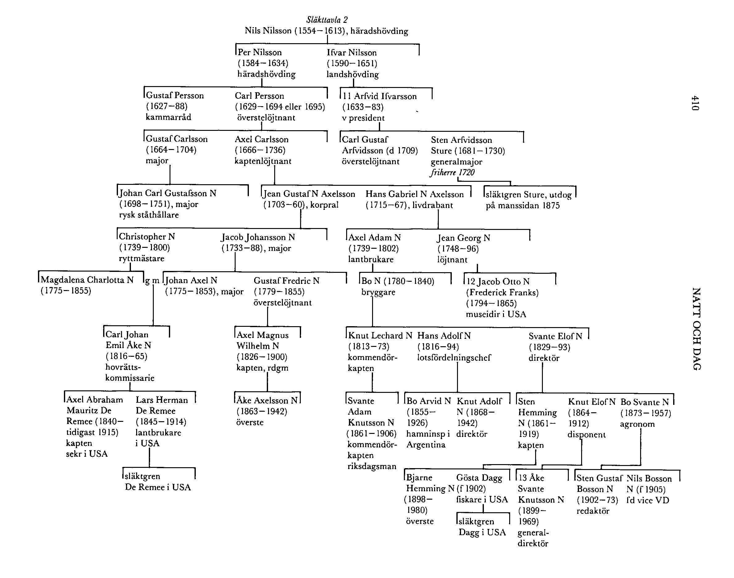 N 8:s äldre son, riksrådet och lagmannen i Östergötland Måns Johansson (N 9), blev farfar till Nils Nilsson (1554–1613) på Säby (nu Bjärka-Säby) i Vist, Ög, som ingick i domstolarna över Charles de Mornay (bd 11) o Archibald Ruthwen 1574, i den beskickning hertig Karl utan framgång sände till Finland 1599 och i den domstol som 1600 i Linköping dömde de anklagade riksråden till döden. Enligt sent belagda obestyrkta uppgifter skall han ha blivit drottning Gunillas hovmästare 1594 och hovmästare hos drottning Kristina dä 1604 (Stiernman). N var 1578-1603 häradshövding i Kinda, Ög, och gifte sig 1609 med Erik XIV:s dotter Sigrid. I ett tidigare äktenskap — med en dotter till riksrådet Bengt Gylta (bd 17) — var han far till Ifvar Nilsson (1590–1651) till Strömsta i Teda, Upps, vilken efter långvariga studier i Tyskland blev assessor i Svea hovrätt 1631 och var häradshövding i Sollentuna i Uppland, Memming i Östergötland och Norra Möre i Småland 1636-39. Efter att ha blivit hovmarskalk hos drottning Maria Eleonora 1639 blev han efter hennes flykt ur riket 1640 administratör av hennes livgeding, och 1641 blev han landshövding i Hudiksvalls län, dvs Gästrikland, Hälsingland, Medelpad och Ångermanland. Sedan Jämtland och Härjedalen genom freden i Brömsebro 1645 avträtts till Sverige, ändrades länsindelningen så att Jämtland kom att bilda Härnösands län tillsammans med Ångermanland och Medelpad, medan Hudiksvalls län, där I fortfarande var landshövding, kom att omfatta Gästrikland, Hälsingland och Härjedalen. Rester av hans arkiv finns i UUB, bla en kopiebok med avskrifter av hans jordabrev (X 278 ab). I blev svärfar till riksrådet och hovrättspresidenten Lars Fleming (bd 16) och far till v presidenten Arfvid Ifvarsson (N 11) till Strömsta. För denne finns i RA ett koncept till friherrebrev från 1678, men det torde aldrig ha blivit expedierat, eftersom han ej kallas friherre i sin likpredikan och hans son generalmajoren Sten Arfvidsson (1681–1730) blev friherre 1720. Eftersom denne var av samma släkt som riksföreståndarna Svante Nilsson och Sten Sture d y och deras grevliga ättlingar, fick han då tillstånd att kalla sig Sture, och han blev stamfar för en släktgren med detta namn som utdog på manssidan 1875. Hans äldre bror Carl Gustaf Arfvidsson (d 1709) hade deltagit i fälttåg i Flandern med den allierade armén 1690 och med den franska 1691 samt i den sv landstigningen på Själland 1700, lindrigt sårats i slaget vid Narva s å, varit med i slaget vid Kliszów 1702 och vid belägringen av Thorn (Torún) 1703, befordrats till överstelöjtnant 1706, deltagit i slaget vid Holowczyn 1708, ånyo lindrigt sårats i striden vid Molatycze s å och stupat i slaget vid Poltava. En syster till Carl Arfvidsson och Sten Arfvidsson Sture blev i äktenskap med k rådet och överståthållaren Knut Posse stammoder för den ännu fortlevande grevliga ätten Posse.