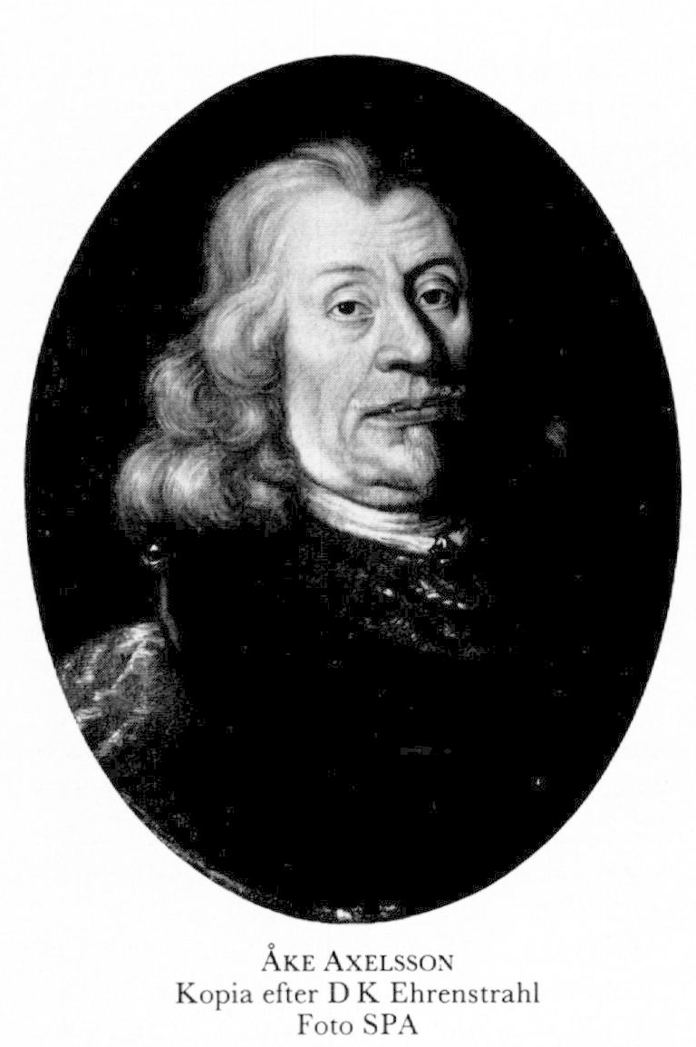 10 Åke Axelsson, sonsons sonson till N 8, f april 1594 på Göksholm, Stora Mellösa, Ör (Marks v Würtenberg), d 1 febr 1655 (E 1052) på Rinkesta, Ärla, Söd, begr i Stora Mellösa (Marks v W). Föräldrar: häradsh Axel Johansson o Ingel Bonde. Inskr vid univ i Helmstedt 15 mars 10, i Wittenberg 29 mars 10, kammarjunkare hos Gustav II Adolf 12, disp vid univ i Tübingen 6 april 14, hertig Karl Filips hovråd 17, lagman i Närke från något av åren 18–21, kammarråd 21, deltog i utskottsmötena 24, 31, febr 32, nov 32 (lantmarskalk 31–32) o i riksdagen 27, ståth på Kalmar 27–30, v president i Svea hovrätt 30–33, häradsh i Linde o Nora, Ör, Norra Vedbo, Jönk, o Södra Möre samt Ölands norra och södra mot, Kalm, 30—33, riksråd 4 febr 33, hovrättsråd i Svea hovrätt 33, kommissarie vid underhandl:arna m Polen 34–35, rikskammarråd 19 febr 36 (ej 39), riksmarskalk 17 maj 43–5 maj 51, häradsh på Gotland 15 jan 47, frih 20 april 52.