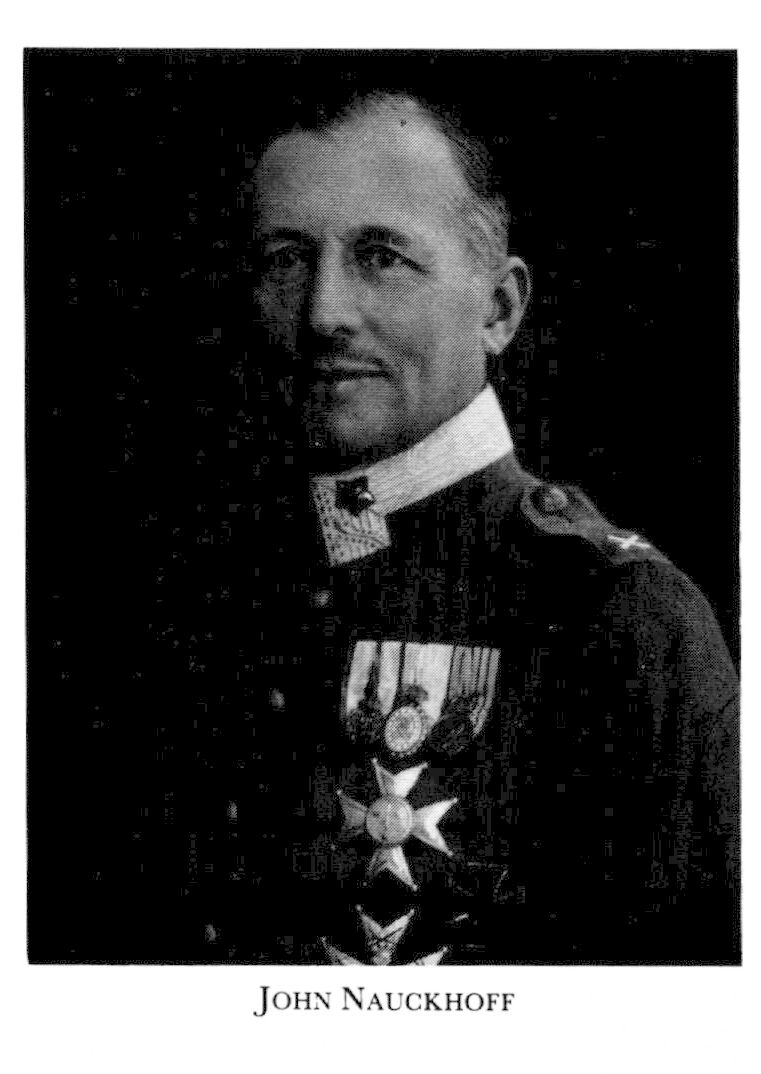 2 Nauckhoff, Johan (John) Gustaf, f 3 nov 1867 i Enköpings-Näs, Upps, d 15 nov 1953 i Sthlm, Engelbr. Föräldrar: bibliotekarien kapten Carl Fredrik Alfred N o Sofia Wilhelmina Loven. Volontär vid Andra livg 4 febr 85, mogenhetsex vid hal i Uppsala 20 maj 85, sergeant 12 juni 86, elev vid krigsskolan på Karlberg 19 juni 86–4 okt 87, underlöjtn vid Andra livg 31 okt 87, genomgick krigshögsk 90-92, löjtn vid Göta livg 6 aug 91, aspirant vid generalstaben 15 april 93–95, stabsadjutant o kapten vid generalstaben 13 juni 02, kapten vid Göta livg 4 juli 02, adjutant hos Oscar II 9 dec 02, generalstabsofficer vid första arméfördeln:s stab 15 okt 04–06, kapten vid Svea livg 5 okt 06, vid generalstaben 16 okt 08, stabschef vid andra arméfördeln 19 okt 08–12, överadjutant o major vid generalstaben 5 febr 09, sekr i infanteriexercissakk dec 10–aug 12, överstelöjtn vid Norra skånska infanterireg 26 april 12, överste o sekundchef för Göta livg 2 juli 15, ordf i Sthlms landstormsförb 16–26, chef för sjunde infanteribrigaden 14 febr 20, led av 1920 års krigslagstiftn:komm aug 20–okt 22, deltog i utarb av förslag till exercisreglemente för infanteriet dec 21–aug 24, led av 1922 års krigslagstiftmsakk juni 22–aug 23, ordf i komm ang förvaltn vid arméns truppförband juni 25–maj 26, generalmajor i armén 21 febr 26, chef för tredje arméfördeln 5 maj 26, för västra arméfördeln 25 nov 26, inspektor för elementarlärov för flickor i Skövde 27, v ordf i styr för Skaraborgs ensk bank ab:s huvudkontor där 30, led av styr för bankens avd:kontor i Sthlm 33, ordf där, avsked med skyldighet att inträda i generalitetets reserv 4 nov 32, generallöjtn där 17 febr 33, ordf i styr för Sveriges landstormsfören:ars centralförb 33–38, i styr för Sveriges allm djurskyddsfören 35–50, för ab Nya Grand Hotel i Sthlm från 35. – LKrVA 21.