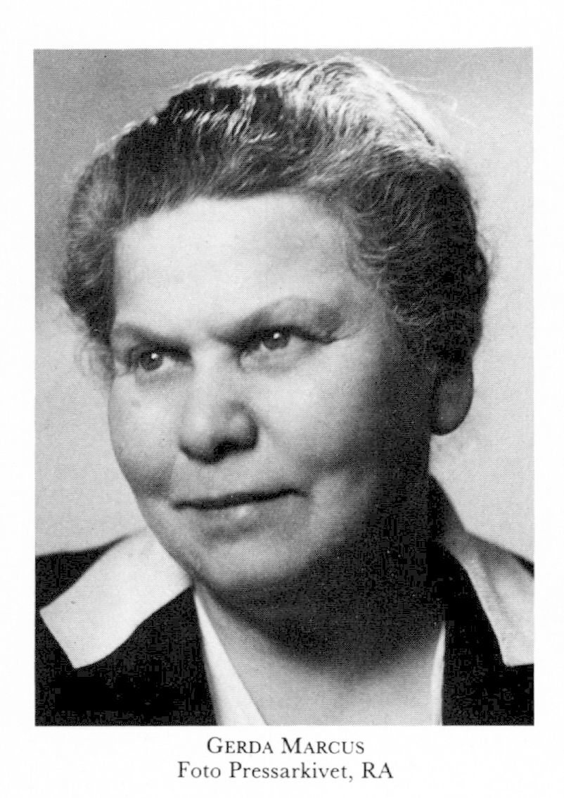 2 Marcus, Gerda Fredrika, sonsons dtr till M 1, f 21 febr 1880 i Sthlm, Mosaiska, d 28 jan 1952 där, Högalid. Föräldrar: grosshandlarenjacob Axel M o Emma Henriette Eliasson. Elev vid Lyceum för flickor o Åhlinska skolan i Sthlm 89–97, anställd vid Thecla Tjäders hyresförmedlingsbyrå där 98, journalist i Berlin för bl a DN o NDA 07–09, red:sekr i teatertidn Thalia 11–13, anställd i SvD:s redaktion 13–20, sekr i Kronprinsessan Margaretas arbetsnämnd för blinda 18–23, en av initiativtagarna vid bildandet av sv Fören Rädda barnen 19, verksam inom Rädda barnen med olika funktioner, bl a general-sekr o föredragshållare, 19–23 o 39–dec 49, korrespondent i Wien o Berlin till bl a SvD o DN 20–30, medarb även i andra tidn:ar, red för Rädda barnens medlemsblad 42–49.