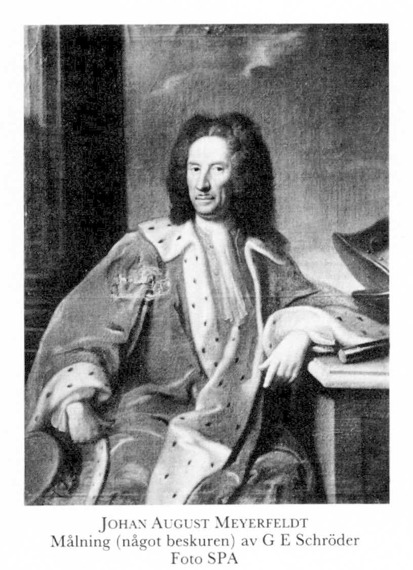 1 Meyerfeldt, Johan August, f 1666 (Frih:-brev) i Livland (Stiernman, s 44 f), d 10 nov 1749 i Sövde, Malm. Föräldrar: överinspektorn o överstelöjtnanten Andreas Meyer, adl M, o Catharina Wolff. Volontär vid v Pahlens livländska kavallerireg 83, kornett där 10 jan 86, löjtn där 2 febr 89–28 april 93, kapten vid Hastfers sv infanterireg i Holland 10 nov 93, major vid Krassows reg där 24 jan 98, avsked 98, överstelöjtn för en skvadron värvade ryttare 2 juni 00, överstelöjtn vid Åbo o Björneborgs läns kavallerireg 15 nov 01, överste där 18 febr 02, överste för ett värvat dragonreg 20 nov 03, generalmajor av kavalleriet 24 febr 04, frih 12 juli 05, generallöjtn av infanteriet o överkommendant i Stettin samt överste för stettinska lantmilisreg 30 aug 10, deltog i riksdagarna 10, 19, 20, 23, 26/27, 31 o 34, v guvernör i Pommern 4 juli 11, general av infanteriet 12 okt 11, generalguvernör i Pommern samt k råd 27 mars 13, greve 3 mars 14, interimschef för amiralitetet 6 april 14, kansler vid univ i Greifswald 26 jan 15, rikskansliråd 23 juni 19–11 okt 20, avsade sig alla ämbeten 47.