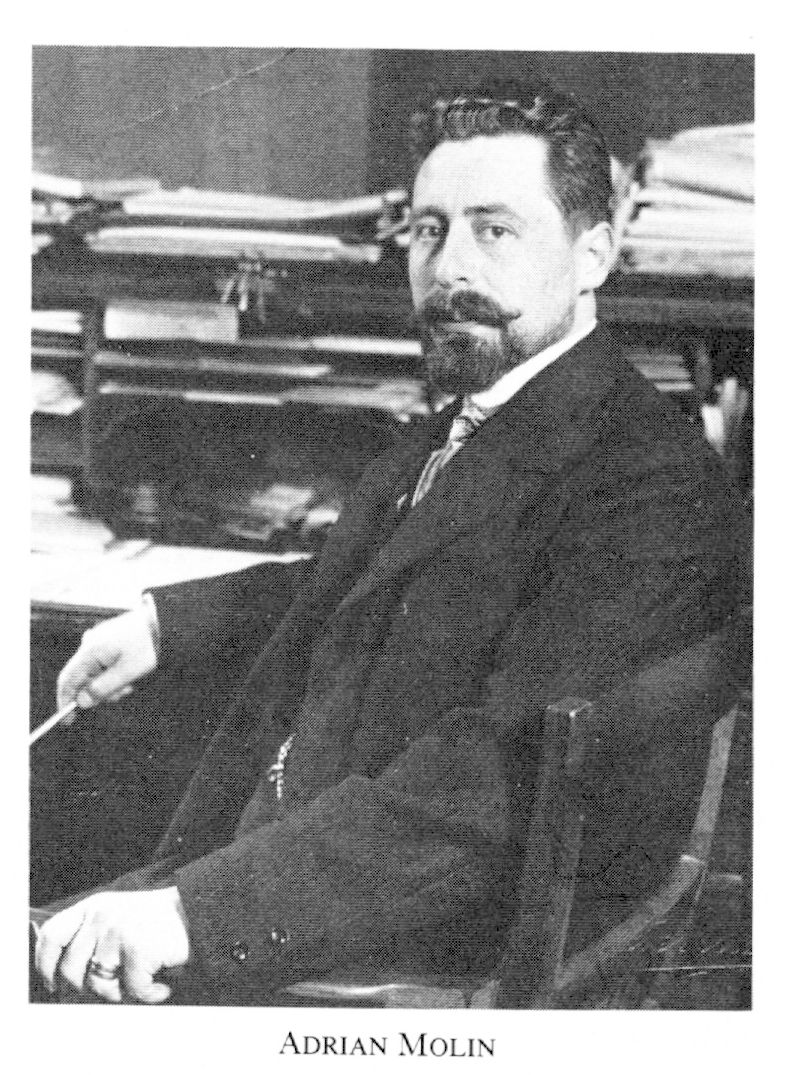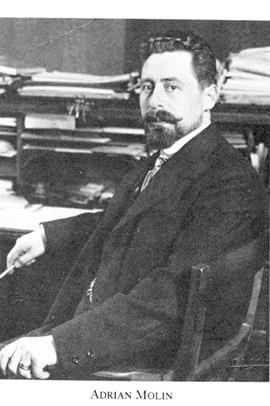 Molin, Adrian Leopold, f 5 mars 1880 i Varberg, d 10 aug 1942 i Sthlm (enl db för Lidingö). Föräldrar: kustvakten Anders M o Maximiliana (Mili) Andreasdtr. Mogenhetsex vid Gbgs h reallärov vt 99, inskr vid GH 8 sept 99, FK där 13 sept 02, inskr vid UU ht 03, FL vid GH 7 juni 05, disp där 30 maj 06, FD där 1 juni 06, medarb i Gbgs aftonbl 06, i SvD 07, sekr o ombudsman i Nationalfören mot emigrationen från 07, utg av Det nya Sverige 07–26, av Hem i Sverige från 08, led av styr för ab Småbruk i västra Sverige aug 08–17, av styr för ab Värmlandshem dec 08–23, av styr för Västgöta-Dals egnahems-ab dec 10–17, av komm ang egnahemsfrågan jan 11–nov 16, av bostadskommissionen jan 12–nov 18, VD i ab Sv jordförmedling från okt 13, i Mälareprovincernas egnahemsab (från 21 ab Mälarhem) dec 14–22, led av styr för ab Likvidator 15–19.