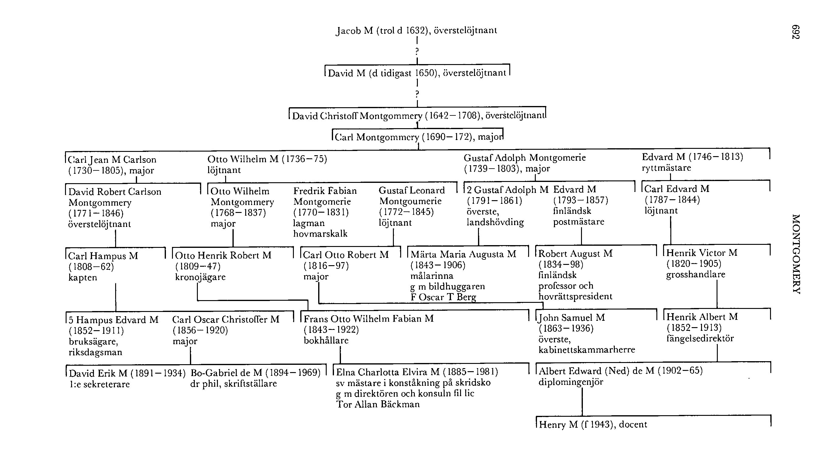 Källor o litt: Allmänt: Carpelan, 2 (1958); B G de M, Origin and history of the M:s (1948); David M, Några bidrag till belysning af frågan om ätten M:s n:r 1960 B härstamning (PHT 1910); dens, Bidrag till släkten M:s hist (PHT 1913); densammes historik för släkten M:s äldre led i Elgenstierna 5 (1930), s 272 IT; [Gustaf Adolphsson M,] Stamtafla öfver adeliga ätten Montgommerie, N° 1960 B (1823); The complete peerage, 4 (1982), sp 133-138; The Scots peerage, 3 (1906), s 421 tf, 9 (1914), s 693–698. – Rogerius de "Montgomeri" eller "Monte Gumeri": J F A Maron, Roger de M and his sons (Transactions of the Royal historical society, 5:13, 1963); Recueil des actes des ducs de Normandie de 911 å 1066 (1961), särsk s 267 o 318; The diction-ary of national biography, 17 (omtr 1937–38), s 101; G Wunder, Wilhelm der Eroberer und seine Verwandten in der Sicht der kontinentalen Dynas-tengenealogie (Genealogisches Jahrbuch, 6–7, 1967), s 32, 40. – Alexander o John Montgomerie: The dictionary of national biography, 13 (omtr 1937– 38). – Jean de Montgomeri: E 838 (Tyskland o tyska kriget 1631): mars, RA; Tyske Kancellis inden-rigske afdelings arkiv A 46, DRA; Kancelliets Brev- beger 1627-29 (1929); Kong Christian den IJerdes egenhaendige Breve, 2 (1889-91); B G de M, a a, s 277; N Slange, Den stormaegtigste Konges Christian den herdes ... Historie, 1–3 (1749), s 575 o 610. – Louis de Montgomeri: Lat o tyskt RR 1628, f 182 v, o 1631 jan-mars, f 180v-181, Skr till konungen: Gustaf 11 Adolfs tid, E 838: mars, Gallica, vol 549: Bengt Oxenstiernas brev 1/11 juli 1631, RA; Tyske Kancellis indenrigske afdelings arkiv A 46, DRA; AOSB 2:1 (1888); J Mankell, Uppgifter rörande sv krigsmagtens styrka, sammansättning o fördelning sedan slutet av femtonhundratalet (1865), s 113; B G de M, a a, s 277. – Jacob Af: Rullor 1630, vol 37, o 1632, vol 17, KrA; AOSB 1:7 (1926); Arkiv till upplysning om sv krigens o krigs-inrättningarnas hist, 3 (1861), s 14; Monro, His expedition with the worthy Scots regiment ... (1637), 2, s 99. – Hugh M (d tidigast 1639): Rullor 1630, vol 29-32 o 37, 1631, vol 16-21, 1632, vol 10–21, 1639, vol 15–17, KrA. – Johan M: Rullor 1633, vol 10, o 1641, vol 10, p 87, KrA. – Hugh Af (d tidigast 1656): Rullor 1656, vol 10, p 194, KrA. -DavidM: Kammarkolks kanslis arkiv E I a 1): 11, f 4, RKB 1650, f 315, E 155 (skr till Carl Gustaf), RA; N W Marks v Wurtenbergs genealogier, RHA. – David Christoff Montgommery: Biographica, M 1116, Sköldebrevsaml, Likv, RA; X 18 (A A v Stiernman, Svecia illustris), UUB; S Carlsson, Ståndssamhälle o ståndspersoner 1700–1865 (1949); Frälseg 3:2 (1947); Förteckning öfver arméns regementen o regementsofficerare i början af Karl XILs regering (HT 1886), s 375; Lewenhaupt; W Stenhammar o R Stenbock, K andra livgrenadjärregementet (1941). – Carl^Montgom-mery: M 1116, Sköldebrevsaml, RA; J O Akersteins genealogier (meritförteckn), RHA; Frälseg 3:2 (1947); Lewenhaupt; Stenhammar o Stenbock, a a. – Gustaf Adolph Montgomerie: Krigsexp:s arkiv B I a: 72: 12 jan 1774, M 1116, RA. - Märta Maria Augusta Berg,f M: B v Malmborg, Sv porträttkonst under fem århundraden (1978); SKL. – Robert August M; W Ch[ydeniu]s, Robert August M (FBH 2, 1903); O Jussila, Lagberedningen som autonomins skyddsvakt (FHT 1986); R A W[rede], Robert August M (Kansallinen elämäkerrasto, 4, 1932). – Otto Wilhelm M: Krigsexp:s arkiv Bla: 72: 12 jan 1774, M 1116, RA; U Johanson, Rulla över befäls-kårerna vid Sveriges armé o flotta 1755 (1976); A Kugelberg, Biogr ant:ar om officerare med vederlikar 1619–1927 (K första livgrenadjärregementets hist, 5, 1930). – Fredrik Fabian Montgomerie: Biographica, M 1116, Ericsbergsarkivets autografsaml, RA; S E Bring, Sv boklexikon 1700-1829, Rätte-gångshandkar (1958); Broomé; O Eneroth, Herregårdar uti Södermanland (1869); C Forsstrand, De tre gracerna (3. uppl, 1912); dens, Den siste rikskanslern o hans döttrar ... (1927), s 136; S Hedar, Högsjögård (1945); G Hellström, Sigtunaborgmästaren o riksdagsmannen Johan Sundblad (PHT 1958); S Högberg, M över LPS 1766-1815 (1961); Kugelberg, a a; N Sjöberg, Åkerö (Sv slott o herresäten vid 1900-talets början, Södermanland, 1908), s 315; B G Söderberg, Södermanland (Slott o herresäten i Sverige), 2 (1968), s 295, 304. – Gustaf Leonard Montgoumerie; M 1116 o 1833, RA; K K:son Leijonhuvud, K Södermanlands regementes hist, 3 (1919). – John Samuel M: E Anderson, Södra skåningarna o dess chefer (Södra skåningarna 1944, nr 6); Generalrcgister öfver Samfundet SHT:s ledamöter 1844–1912 (1913); Hulthander; K gymnastiska centralinstitutets hist 1813-1913 (1913), s 370; Kugelberg, a a; K Svea livgardes hist, 5 (1976); [O F Österman,] F d översten John Samuel M (KrVAH 1936, s 246 f); W Ridderstad, "Gula gardet" 1526-1903 (1903); SMoK; SPG; T Wen-nerström, K krigsakademien o k krigsskolan åren 1792-1935 (1936); T Winberg, Södra skåningarna 1811-1949 (1950), s 420-424; Väd? 1935 (1934). – Otto Wilhelm Monlgommery: Allm verks skr till K M:t, vol 707: 20 april 1816, RA; Sveriges krig 1808 0 1809, 9:1 (1922), bilagor, s 90 o 94; H Wichman, Jämtlands regemente i krig o fred (Jämtlands o Härjedalens hist, 4, 1962), s 301; dens, 1718-1814 (K Jämtlands fältjägarregementes hist, 1966). – Elna Charlotta Elvira M: Allhems sportlexikon, 3 (1951); NF:s sportlexikon, 5 (1943); Väv? Skånedelen (1948), s 102. – Carl Jean M Carlson: Krigsexp:s arkiv B I a: 72: 12 jan 1774, Allm verks skr till K M:t, vol 670: 1 maj 1779, RA; Johanson, a a; Sten-hammar o Stenbock, a a; T Säve, Sveriges deltagande i sjuåriga kriget åren 1757–62 (1915). – David Robert Carlson Montgommery: M 1116, RA; Meritförteckmar, vol 1, KrA;, T A Fischer, The Scots in Sweden (1907); Index över sv porträtt 1500-1850, 2 (1939); Kugelberg, a a; L W:son Munthe, Axplockning ur en gammal stambok (PHT 1925); G Petri o H Levin, Regementets öden från S