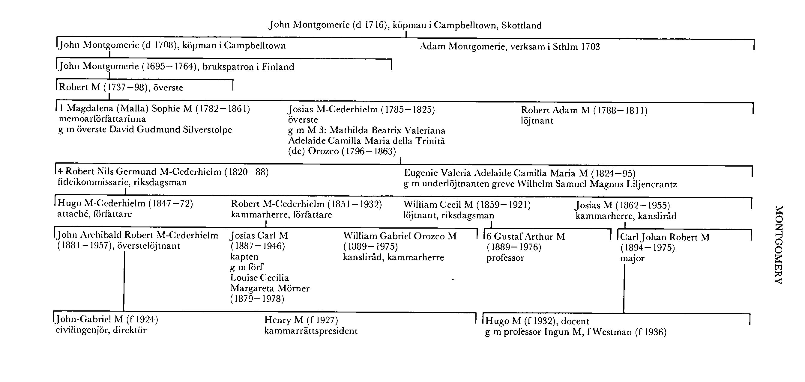 1736 utfärdade konung Fredrik I för brukspatronen John Montgomerie (1695–1764) brev på naturalisation som sv adelsman. Denne uppges i detta brev ha företett bevis på sin härkomst från en urgammal adlig släkt i Skottland och kommit till Sverige 16 år tidigare. 1728 hade han fått burskap som handelsman i Sthlm, varvid han uppgavs vara född i Glasgow. Hans son har i brev (Malla M-Silfverstolpe) uppgett, att John Montgomeries far var "pair av Skottland" och hade 21 söner, av vilka 7 skulle ha omkommit vid James Edward Stuarts försök att bli konung av England och Skottland. Dessa uppgifter har emellertid vid arkivforskningar i Skottland visat sig vara utan verklighetsunderlag. I stället har konstaterats (Archie M:s PM 1975), att John Montgomerie var son till köpmannen John Montgomerie (d 1708) i Campbelltown, där han vid försäljningen av en fastighet 1733 uppges vara köpman i Sthlm. Fadern John Montgomeries far hette också John Montgomerie (d 1716) och var också köpman i Campbelltown, och dennes son Adam Montgomerie hade enligt skotskt källmaterial varit verksam i Sthlm 1703. Eftersom denna familj förde samma vapen som den förutnämnde David Christoff Montgommerys ättlingar, anses de ha tillhört samma släkt. Då inga säkra uppgifter finns om deras förfäder, synes det emellertid omöjligt att veta, hur de var befryndade. Den huvudsakligen på heraldiska iakttagelser (David M 1913, s 108 f) grundade uppfattningen (David M 1913, släkttavla mellan s 230 o 231), att de skulle härstamma från var sin sonson till den förutnämnde Alexander Montgomerie (d omkr 1470), har ej kunnat verifieras. Den till Sverige inflyttade John Montgomerie blev tidigast 1723 förläggare för Georg Löwens (bd 24, s 572) järnbruk Skebo i Ununge och Ortala i Väddö, Sth, vilka han arrenderade från 1728. Löwens anspråk på att trots detta behålla ledningen av bruken ledde till långvariga processer, och då han 1733 avhände sig dem till en annan person, var han skyldig Montgomerie mer än 500 000 dlr. Först sedan denne fått dessa pengar, avstod han 1737 från bruken, men ännu 1750 stämdes han av Löwen. 1731 hade Montgomerie köpt Torby och Antskog i Pojo socken i Nyland, där han återuppbyggde Fiskars masugn och anlade en ny hammare vid Antskog. Senare köpte han bl a Persböle säteri i Pojo 1737 och Koskis bruk i Bjärnå socken i Egentliga Finland med Kulla masugn i Tenala socken i Nyland s å. Montgomeries ekonomiska ställning var dock ganska svag, och 1740 fick bl a hans svärfar kommerserådet Robert Cambell (bd 7, s 263) och hans hustrus morbror grosshandlaren Jean Bedoire d y (bd 3) i Sthlm inteckningar i hans egendomar, vilka inteckningar förnyades 1750. 1752 sålde han alla sina egendomar i Finland till handelshuset Tottie i Sthlm, som 1749 av honom köpt Herrängs gruva i Häverö, Sth.