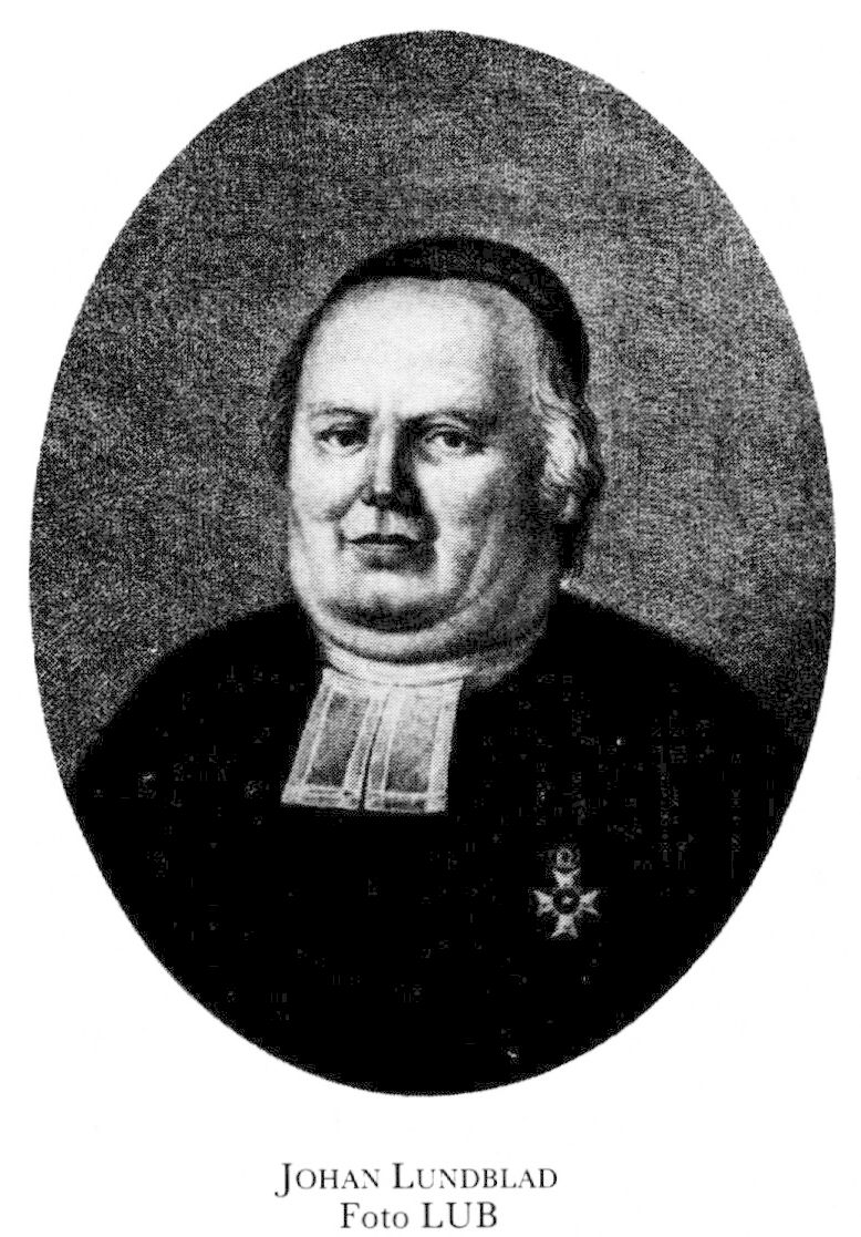 1 Lundblad, Johan, f 1 mars 1753 i Tönnersjö, Hall (fdb saknas), d 20 (ej 18) juni 1820 i Lund. Föräldrar: torparen Knut Larsson o Pernilla Kiällsdtr. Elev vid gymnasiet i Gbg 72, inskr vid univ i Leipzig 21 maj 74, mag där 22 febr 76, studier vid univ i Halle o Greifswald 77, inskr vid LU 26 april 79, doc i romersk vältalighet där 8 jan 81, prästv i Lund 31 maj 81, eo bataljonspredikant vid H H v Salzas värvade reg i Gbg 81, bokauktionsnotarie i Lund 21 febr 84, akad:bokhandl där 22 april 84, boktryckare i Malmö 10 mars 86–88, eo prof i romersk vältalighet o poesi vid LU 16 okt 87, boktryckare i Lund 5 dec 88, ord prof i nämnda ämnen från 17 juni 89 (tjl från 6 okt 19), kh i S:t Peters kloster o Nöbbelöv, Malm, 6 febr 93, prost där 22 april 95, prof i historia vid LU 5 nov 98–2 april 99, TD vid UU 1 nov 00, kh i Hardeberga o Sandby, Malm, från 06. – LVHAA 19.