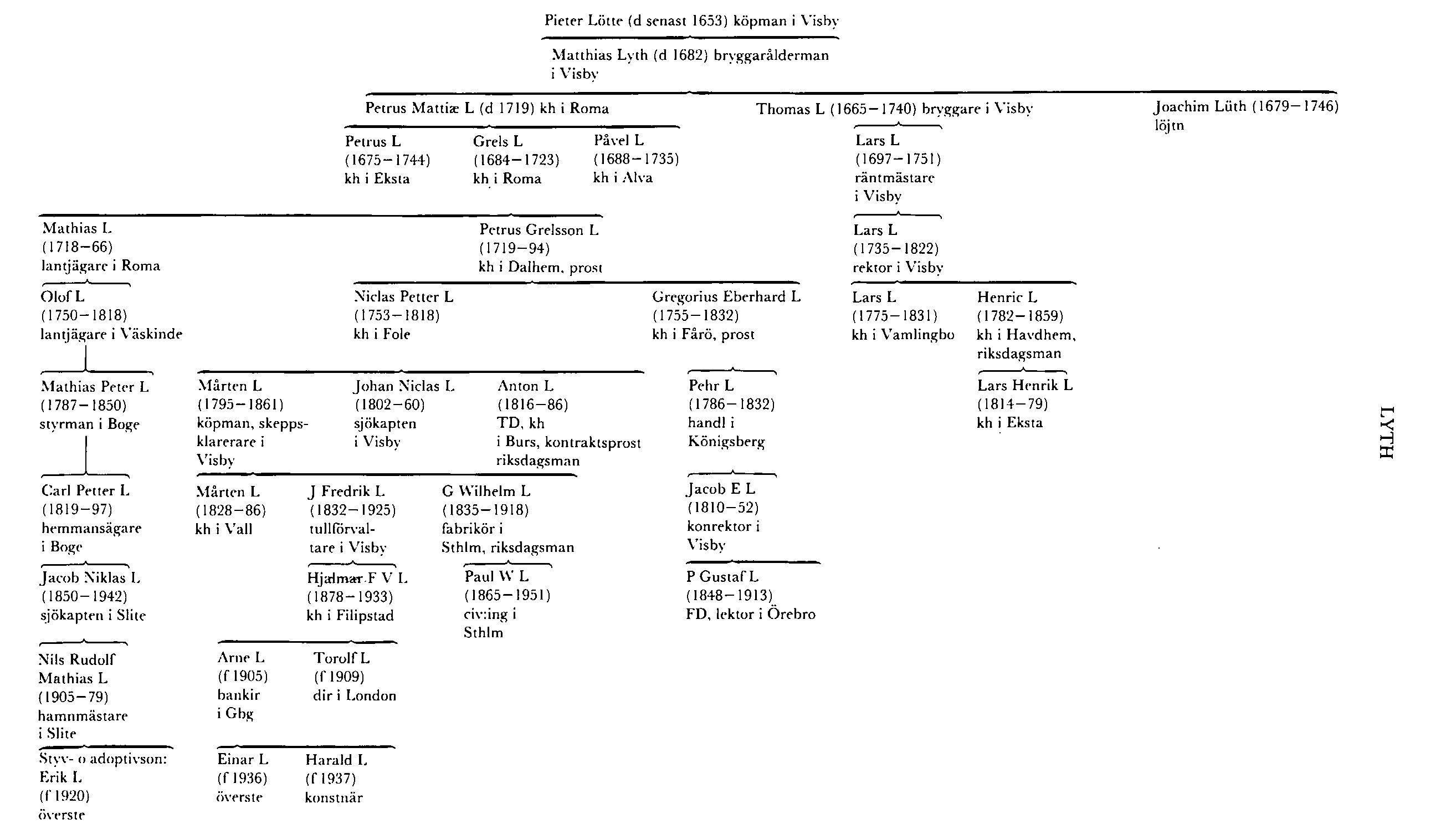 Lyth, släkt, vars till namnet okände sv stamfar enligt obestyrkt tradition (Butendorff) skall ha flyttat till Gotland från Lüttich (Liège) i slutet av 1500-talet. En person, som i Visby rådhusrätts protokoll och i tullräkenskaper kallas bl a Peder Lyt och Peder Lytt men själv skrev sig Pieter Lötte (d senast 1653), namnes från 1625 som köpman i Visby (Bolling). Han var troligen far till bryggaråldermannen Matthias L (d 1682), som i Visby äldsta dpb ofta kallas Matthias Pettersson och var far till Joachim Lüth (1679–1746). Denne inskrevs vid UU 1698 såsom "Joachimus Mathiae Lijt" och deltog från 1703 i Karl XII:s fälttåg. Han blev sårad i vänstra benet vid belägringen av Thorn s å och deltog i slagen vid Fraustadt 1706 och Holowczyn 1708. Befordrad till löjtnant 1709 deltog L s å i slaget vid Poltava och fördes efter kapitulationen vid Perevolotjna s å fången till Solikamsk i västra Sibirien, varifrån han kom hem 1722. L:s i LUB bevarade dagbok 1703–10 och 1715–22 publicerades i KKD 2 (1903).