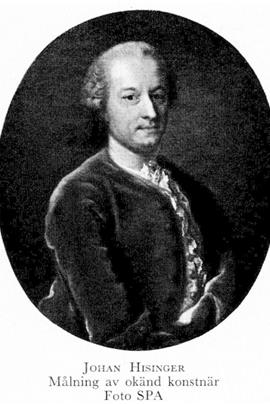 2 Hisinger, Johan (före adl Hising), son till H 1, f 31 jan 1727 i Sthlm, Nik, d 19 maj 1790 på Fagervik i Ingå sn, Nyland, Finland. Inskr vid UU 12 okt 37, auskultant i bergskoll 23 nov 47, v notarie där 49, avsked 12 sept 58, assessors titel 22 nov 58, adl 23 jan 70, bergsråds titel 13 febr 78. Bruksägare, lantbrukare.