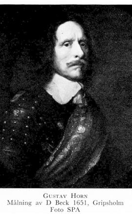 5 Horn, Gustav, bror till H 4, f 22 okt 1592 på Örbyhus, Vendel, Upps, d 10 maj 1657 i Skara, begr i Sthlm, Jak. Vistades vid utl univ 09—12, i sv krigstjänst 12—14, utl studieresa 14—18, k kammarherre 18, överste för ett norrländskt reg 21, riksråd 2 april 25, riddare s d, fältmarskalk o högste befälhavare i Livland 20 april 28, kommenderande general över trupperna i Pommern o Neu...