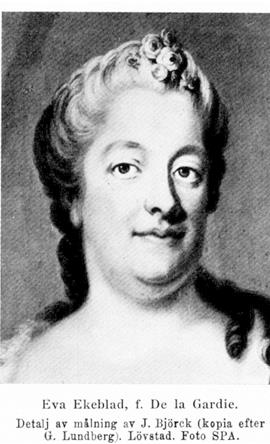5. Eva Ekeblad, född De la Gardie, den föregåendes hustru, f. 10 juli 1724 i Stockholm (dp 12 juli, Jak.), d. 15 maj 1786 i Lidköping. Föräldrar: riksrådet och överstemarskalken greve Magnus Julius De la Gardie och grevinnan Hedvig Catharina Lillie. LVA 1748.