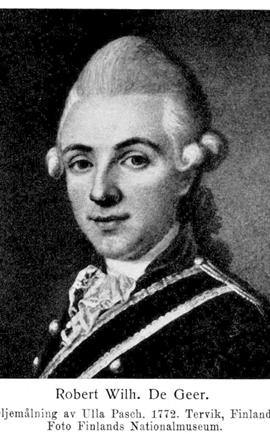 6. Robert Wilhelm De Geer, son till D. 2, friherre till Tervik, finsk greve, f. 15 juli (juni?) 1750 på Tervik i Pernå socken, Finland, d 4 nov. 1820 i Helsingfors. Kadett vid amiralitetskadett-kåren i Karlskrona 1764; underofficer därstädes 1766; avlade officersexamen 1766; fänrik vid livgardet 12 juli 1768; kapten och chef för Sulkava kompani vid Savolax' fotjägarkår 18 sept. 177...