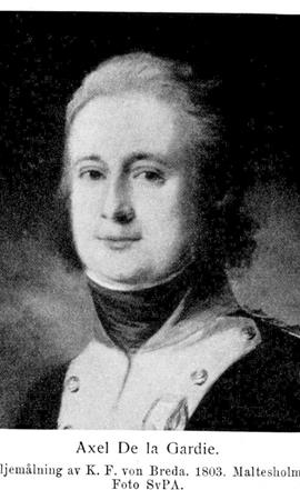 16. Axel Gabriel De la Gardie, den föregåendes broder, f. 23 nov. 1772 i Stockholm, d 15 jan. 1838 på Maltesholm i Östra Sönnarslöv. Korpral vid Västgöta kavalleriregemente 2 juli 1777; sergeant vid Västmanlands regemente 24 jan. 1781; sekundadjutant därstädes 7 febr. 1781; fänrik 12 apr. 1786; stabslöjtnant vid premiärmajorens kompani 25 mars 1790; stabsadjutant hos konungen och k...