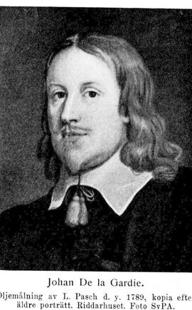 2. Johan Pontusson De la Gardie, den föregåendes son, friherre till Ekholmen, herre till Kjuloholm och Rasik m. fl. egendomar (se nedan), f. 3 maj 1582 i Reval, d 10 mars 1640 på Steninge i Husby-Ärlinghundra. Reste efter tidigare studier i utlandet; ståthållare på Åbo slott och över dess län 15 sept. 1611; erhöll i uppdrag att förhandla med ständerna i vissa delar av Finland 10 ja...