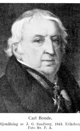 12. Carl Jöran Bonde, f. 22 juli 1757 på Fituna, d 24 okt. 1840 på Nynäs. Föräldrar: kaptenen Jöns Alexander Bonde och Ulrika Eleonora Rosenhane. Student i Uppsala 13 juni 1769; underkonduktör vid fortifikationen 1773; fänrik vid livgardet 5 apr. 1775; en av faddrarna vid kronprinsens dop 1778; löjtnant 8 febr. 1779; uppvaktande kavaljer hos kronprinsen 24 jan. 1782−89; stabskapten 31 mars 1...