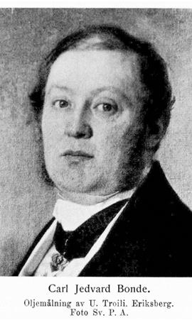 15. Carl Jedvard Bonde, sonson till B. 12, f. 4 mars 1813 på Eriksberg, Stora Malms socken, d 24 dec. 1895 därstädes. Föräldrar: överstekammarjunkaren och fil. doktorn friherre Karl Karlsson Bonde och Ingeborg Bonde. Åtnjöt skolundervisning i Bremen. Fanjunkare 28 apr. 1830; fänrik vid Svea livgarde 23 apr. 1831; student i Uppsala 22 nov. s. å.; attaché vid beskickningen i Paris 1 ...