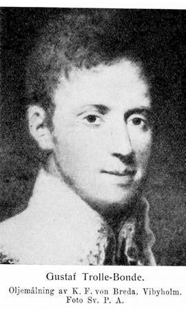 13. Gustaf Trolle-Bonde, son till B. 11, f. 28 mars 1773 på Vibyholm i Årdala socken, d 3 jan. 1855 i Stockholm. Innehade Sävstaholm, Bordsjö, Katrineholm, Härrestad, Askeryd, Trolleholm, Björnö och Hässelby samt erhöll såsom innehavare av Trolleholms fideikommiss K. M:ts tillstånd att kalla och skriva sig Trolle-Bonde 16 maj 1809. Student vid Uppsala universitet 2 mars 1790−92; ka...