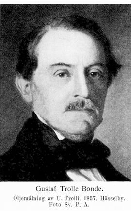14. Gustaf Trolle Bonde, den föregåendes brorson, f. 3 febr. 1806 i Stockholm, d 5 febr. 1884 därstädes. Föräldrar: överstekammarjunkaren greve Fredrik Ulf Bonde och grevinnan Ulrika Johanna Lewenhaupt. Student i Uppsala 6 juni 1821; kvartermästare 8 febr. 1823 och kornett 22 apr. s. å. vid livregementets husarkår; avlade lilla matematiska examen 3 juni s. å.; löjtnant. 28 maj 1828...
