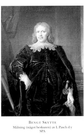 2 Skytte, Bengt, son till S 1, f 30 sept (Peringskiölds ättebok, RHA), dp 9 okt 1614 i Sthlm, Nik, d 1683 (bet för själaringn 20 juli i Sthlm, Jak). Frih 16 juni 24, inskr vid UU okt 24, medföljde Jakob Spens' legation till England 29, riddare där 29, kammarherre hos drottn Kristina 4 dec 33, gjorde ett flertal resor bl a till Tyskland, Frankrike, Italien, England o Holland 34–35, t...