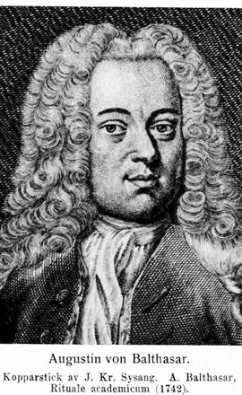 2. Augustin von Balthasar, den föregåendes broder, f. 20 maj 1701 i Greifswald, d. 20 juni 1786 i Wismar. Åtnjöt privat undervisning; studerade vid Greifswalds gymnasium 1715–18; student i Greifswald 9 apr. 1718. Disp. 1719 (De œena adulterii ex jure divino et humano, pres. Ph. B. Gerdes) och 1723 (De ducum Pomeranise meritis in rem litterariam, pres. A. Westphal); idkade studier i...