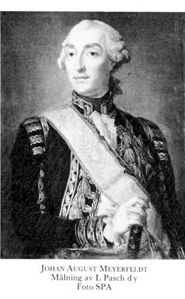 2 Meyerfeldt, Johan August, son till M 1, f 4 maj 1725 i Stralsund, S:t Nikolai, d 21 april 1800 i Sthlm, Klara. Förare vid greve Dohnas reg i Stralsund 4 maj 37, kammarherre 6 juni 39, kapten vid drottningens livreg 13 juni 44, deltog i riksdagarna 51/52, 55/56, 65/66 (led av SU), 69/70, 71/72, 78/79 o 86, major vid Cronhjortska reg 18 dec 51, chef för första tyska grenadjärbataljo...